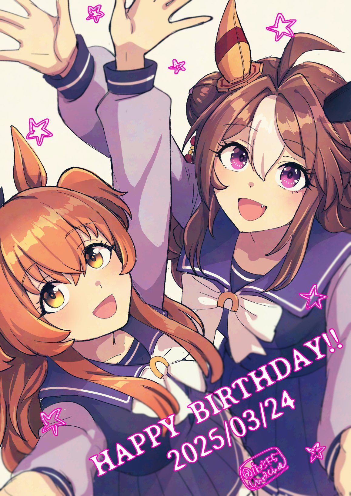 2girls adversarial_noise animal_ears arms_up birthday_connection bow bowtie breasts brown_hair copano_rickey_(umamusume) dated fang hair_bun happy_birthday hi_(ibisf5umauma) highres horse_ears long_hair long_sleeves looking_at_viewer looking_up mayano_top_gun_(umamusume) multiple_girls open_mouth orange_hair outstretched_arms pink_eyes purple_shirt purple_skirt sailor_collar school_uniform shirt skirt small_breasts smile standing star_(symbol) tracen_school_uniform two_side_up umamusume yellow_background yellow_eyes