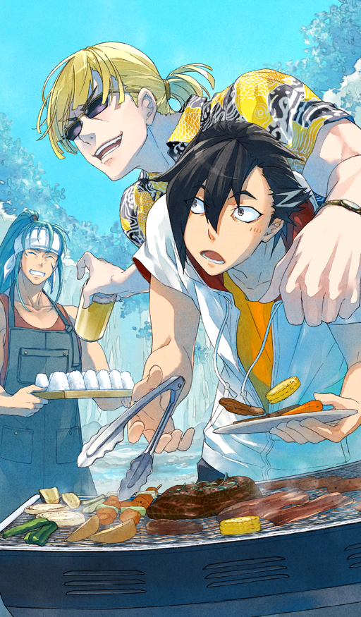 3boys arm_on_another's_shoulder bacon bare_arms black_hair blonde_hair blue_sky can closed_eyes collarbone commentary cooking covered_eyes day drawstring drink_can dutch_angle facial_scar fate/grand_order fate_(series) fisheye food food_request green_hair green_overalls grey_eyes grill grilling hair_between_eyes hair_tie headband high_ponytail holding holding_can holding_plate holding_tongs holding_tray hood hooded_jacket jacket long_hair low_ponytail lower_teeth_only male_focus mandricardo_(bff_bbq)_(fate) mandricardo_(fate) meat medium_hair multicolored_hair multiple_boys muscular muscular_male official_alternate_costume official_art onigiri open_mouth orange_shirt orange_tank_top outdoors over-rim_eyewear overalls partially_open_jacket plate ponytail print_shirt sakata_kintoki_(bff_bbq)_(fate) sakata_kintoki_(fate) scar scar_on_cheek scar_on_face semi-rimless_eyewear shino_touko shirt short_hair short_ponytail short_sleeves sidelocks sky sunglasses sunlight surprised tank_top tawara_touta_(fate) teeth third-party_source tongs tray tree two-sided_fabric two-sided_jacket two-tone_hair vegetable watch white_hair white_headband white_jacket wing_collar wristwatch yellow_shirt