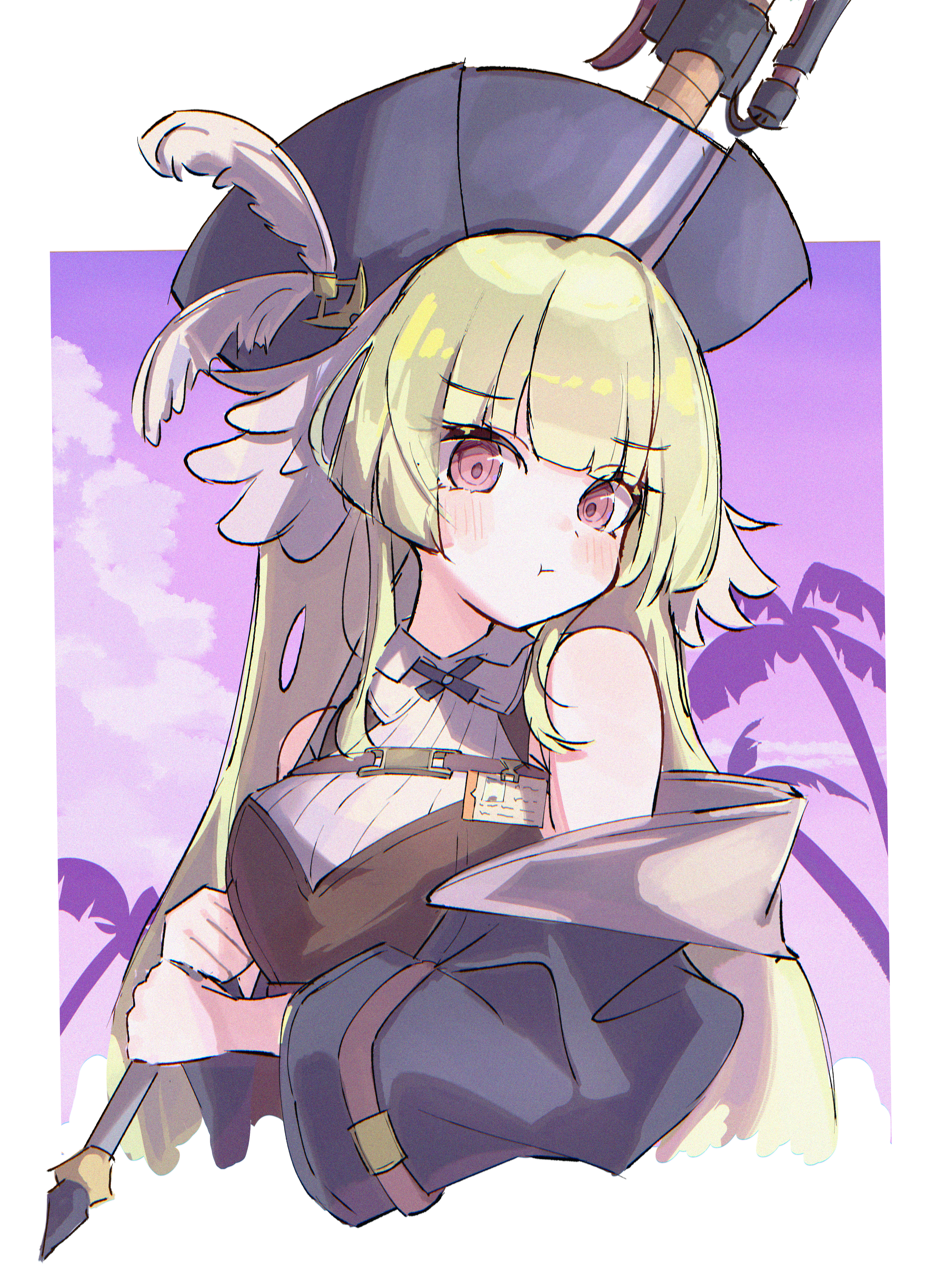 1girl absurdres arknights bare_shoulders black_hat black_jacket blush closed_mouth commentary cropped_torso green_hair hat highres jacket long_hair looking_at_viewer mufetojiiba off_shoulder palm_tree pink_eyes poncirus_(arknights) pout purple_background solo tree