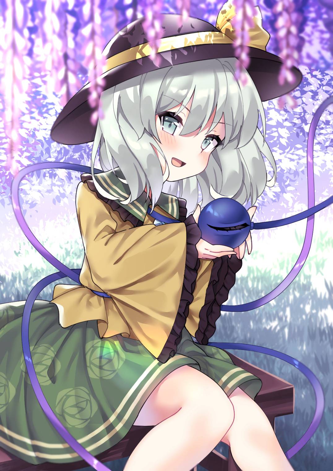 1girl :d black_hat blouse blush buttons commentary_request diamond_button eyeball feet_out_of_frame floral_print flower frilled_shirt_collar frilled_sleeves frills grass green_skirt grey_eyes grey_hair hat hat_ribbon highres holding holding_eyeball juugou_taki komeiji_koishi long_sleeves looking_at_viewer on_bench open_mouth outdoors print_skirt purple_flower ribbon rose_print shirt short_hair sitting skirt sleeves_past_wrists smile solo third_eye touhou wide_sleeves wisteria yellow_ribbon yellow_shirt