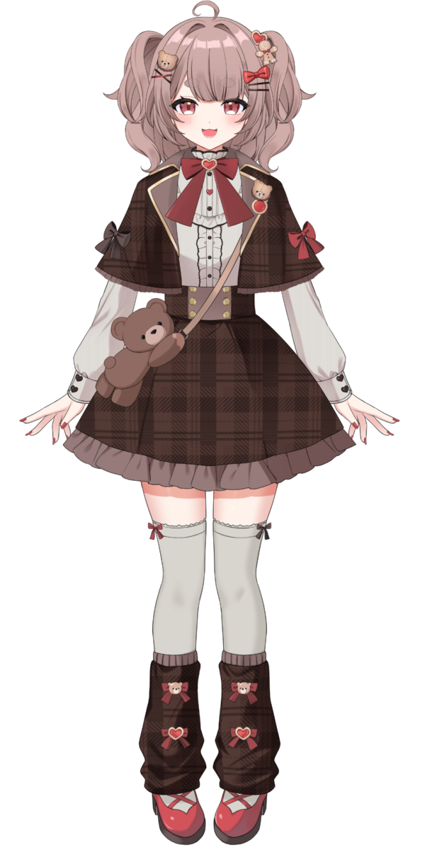 1girl :3 accurate_lolita_coord ahoge animal_bag artist_request bear_bag bear_hair_ornament blush bond_en bondlive bow brooch brown_bag brown_eyes brown_hair brown_leg_warmers brown_skirt fingernails food-themed_hair_ornament full_body gingerbread_man_hair_ornament grey_shirt grey_thighhighs hair_bow hair_intakes hair_ornament hairclip haruka_kumazoe heart heart_brooch heart_hair_ornament highres jewelry leg_warmers lolita_fashion looking_at_viewer lower_teeth_only medium_hair nail_polish official_art open_mouth red_bow red_nails red_shoes shirt shoes short_eyebrows simple_background skirt sleeves_past_wrists solo standing tachi-e teeth thick_eyebrows thighhighs tongue transparent_background two_side_up virtual_youtuber x_hair_ornament
