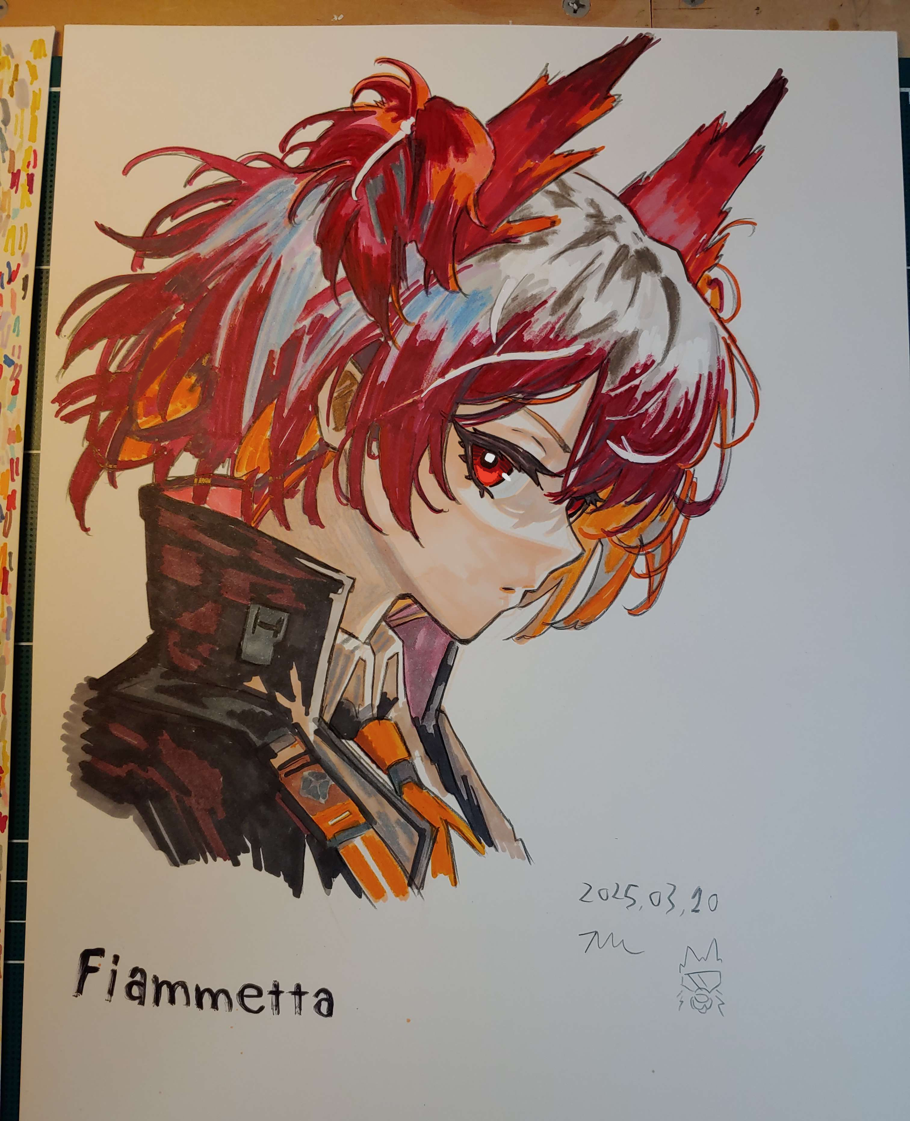 1girl absurdres arknights black_jacket character_name closed_mouth colored_inner_hair cropped_shoulders dated fiammetta_(arknights) grey_hair highres jacket looking_at_viewer marker_(medium) multicolored_hair orange_hair photo_(medium) profile red_eyes red_hair short_hair solo stupid_duran traditional_media