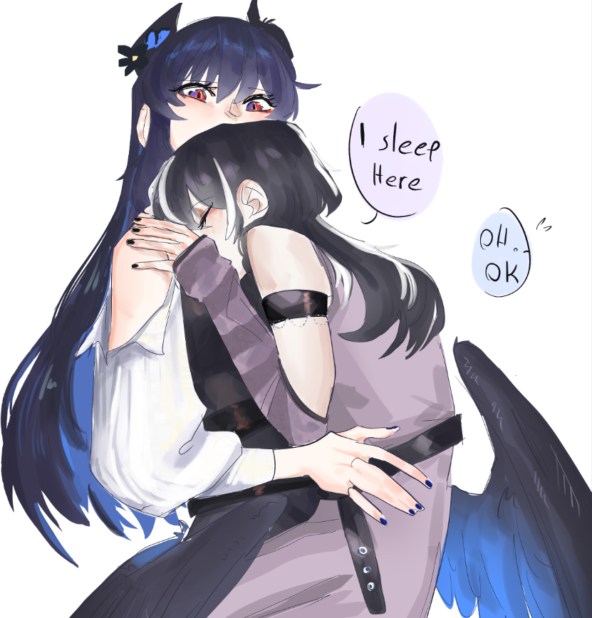 2girls arm_strap arm_warmers black_hair black_horns black_nails black_vest blue_hair closed_eyes colored_inner_hair commentary dress english_commentary english_text grey_arm_warmers grey_dress hololive hololive_english horns low_wings multicolored_hair multiple_girls nerissa_ravencroft nerissa_ravencroft_(1st_costume) red_eyes shiori_novella shiori_novella_(1st_costume) simple_background speech_bubble tibetanyakart two-tone_hair vest virtual_youtuber white_background white_hair wings yuri