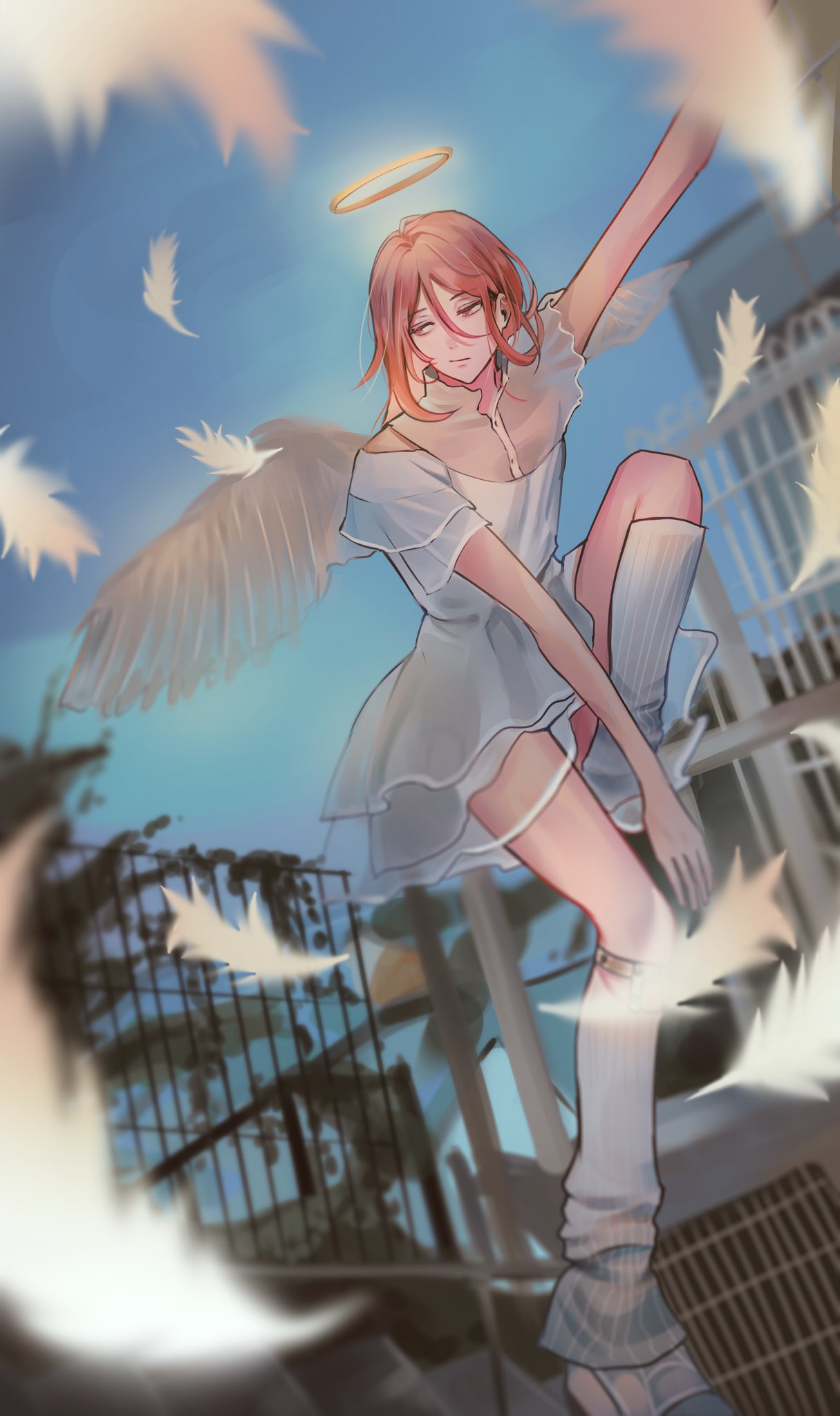 1boy angel_devil_(chainsaw_man) angel_wings arm_up baksa_030 blue_sky blurry blurry_foreground chainsaw_man closed_mouth crossdressing crossdressing_(mtf) dress falling_feathers feathers hair_between_eyes halo highres korean_commentary leg_up leg_warmers long_hair looking_to_the_side red_eyes red_hair shoes sky white_dress white_feathers white_leg_warmers white_shoes white_wings wings yellow_halo