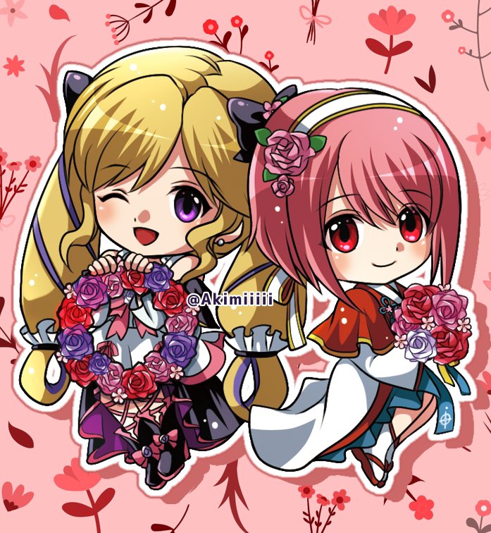 2girls ;d akimiiiii bare_shoulders black_bow black_shoes blonde_hair bouquet bow capelet chibi chibi_only closed_mouth dress drill_hair earrings elise_(fire_emblem) elise_(valentine)_(fire_emblem) fire_emblem fire_emblem_fates fire_emblem_heroes flower flower_necklace full_body hair_between_eyes hair_bow hair_flower hair_ornament hairband holding holding_bouquet holding_flower japanese_clothes jewelry kimono long_hair long_sleeves looking_at_viewer multicolored_hair multiple_girls necklace nintendo official_alternate_costume one_eye_closed open_mouth outline pink_background pink_eyes pink_hair purple_hair red_capelet sakura_(fire_emblem) sakura_(valentine)_(fire_emblem) sandals shoes short_hair smile socks twin_drills twitter_username two-tone_hair very_long_hair white_hairband white_kimono white_outline white_socks wide_sleeves