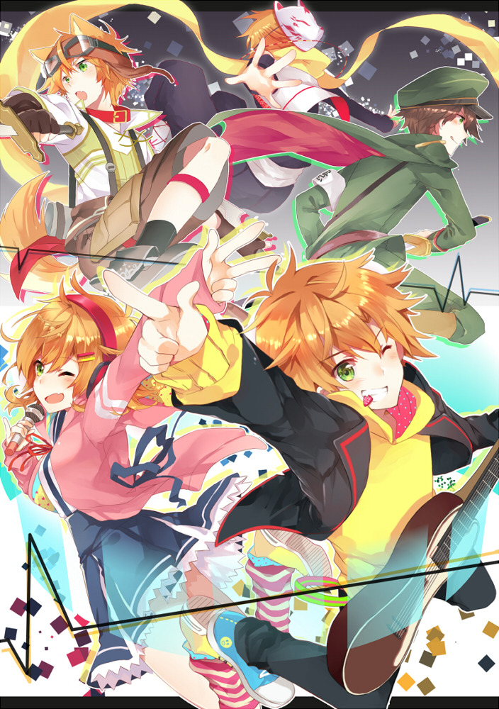 1girl 4boys animal_collar arm_up armband black_jacket brown_hair collar fang fox_mask green_eyes green_hat grin guitar hair_ornament hairclip hat headphones holding holding_guitar holding_instrument holding_microphone hood hoodie instrument jacket licking_lips mask mask_on_head microphone military_uniform mouth_hold multiple_boys one_eye_closed open_mouth orange_hair original pink_jacket plectrum plectrum_in_mouth red_ribbon ribbon short_hair skin_fang smile tongue tongue_out yellow_hoodie yourvoyage