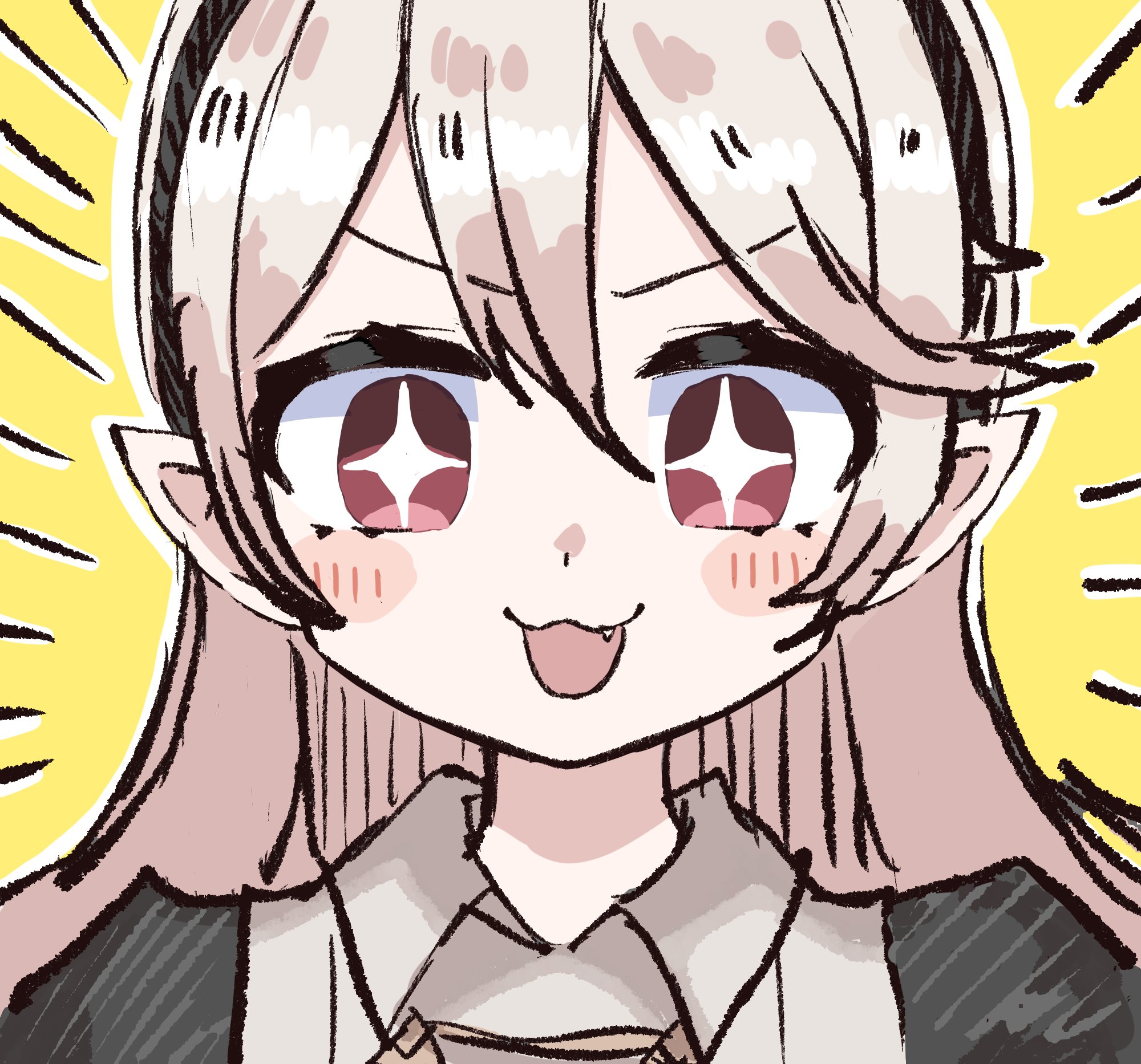 +_+ 1girl black_hairband close-up female_corrin_(fire_emblem) emphasis_lines fang fire_emblem fire_emblem_fates hairband highres jacomodayo long_hair looking_at_viewer nintendo open_mouth simple_background smile solo upper_body v-shaped_eyebrows white_hair yellow_background