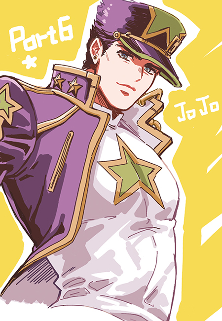 1boy balcony chain coat commentary_request grey_eyes hat jojo_no_kimyou_na_bouken kuujou_joutarou lanxjourney male_focus purple_coat purple_hat solo star_(symbol) stone_ocean upper_body