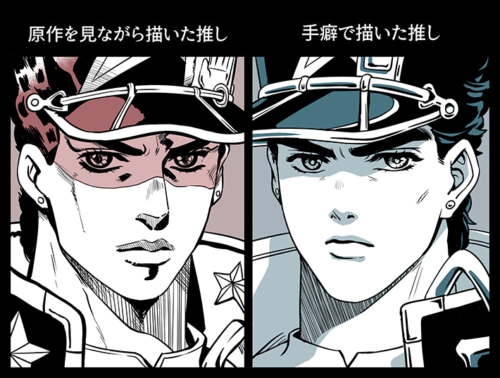 1boy araki_hirohiko_(style) earrings hat jewelry jojo_no_kimyou_na_bouken kuujou_joutarou lanxjourney male_focus meme multiple_drawing_challenge official_style on-model_vs_in_your_style_challenge stone_ocean stud_earrings translation_request