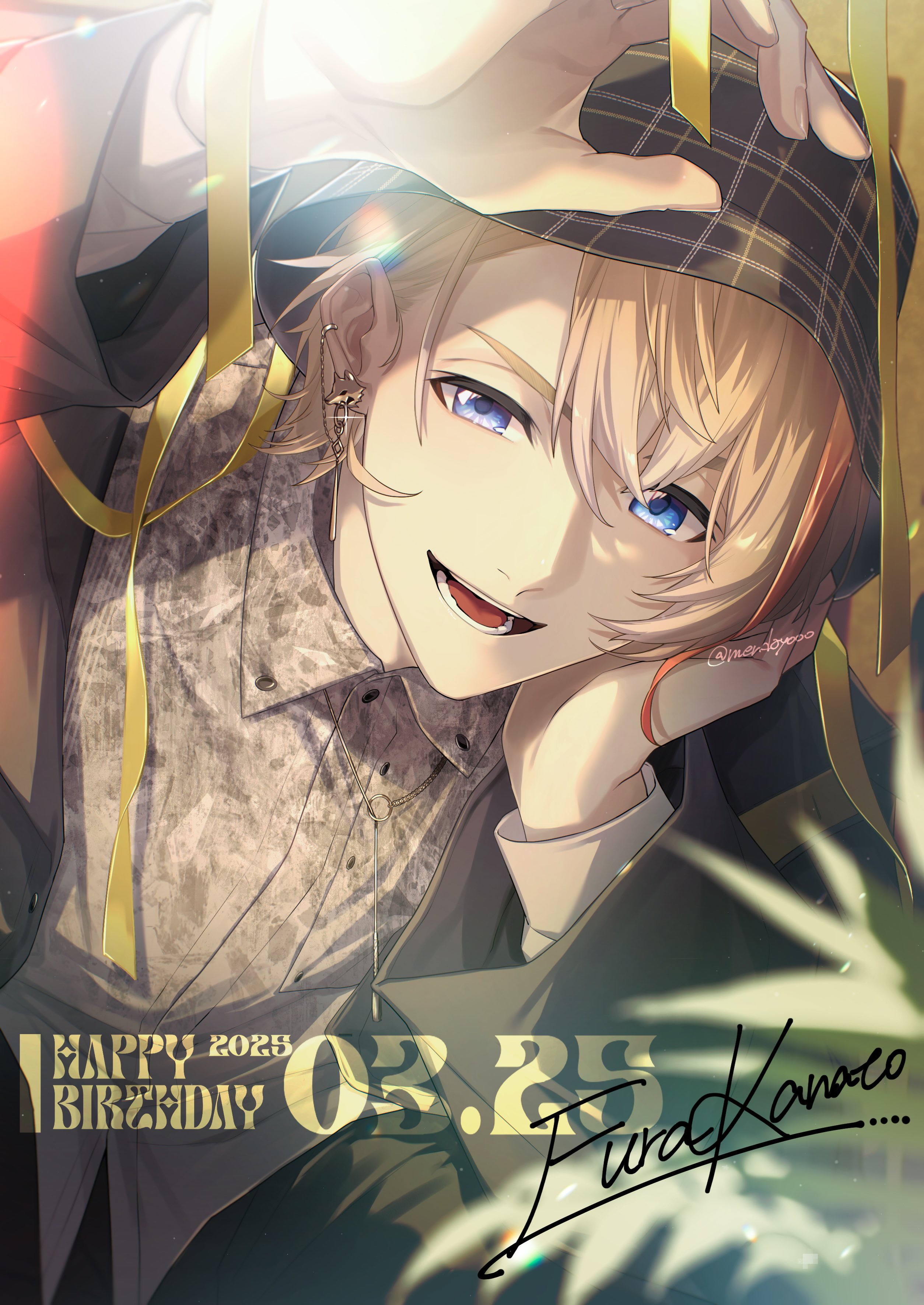 1boy :d absurdres black_jacket blonde_hair blue_eyes bucket_hat collared_jacket collared_shirt commentary_request ear_piercing fura_kanato fura_kanato_(3rd_costume) gold_necklace grey_hat grey_shirt hair_between_eyes hand_on_own_face hand_up happy_birthday hat head_rest highres jacket jewelry lapels lens_flare linked_piercing looking_at_viewer male_focus mendayooo multicolored_hair necklace nijisanji open_clothes open_jacket open_mouth orange_hair parted_lips piercing shirt short_hair smile solo streaked_hair upper_body virtual_youtuber