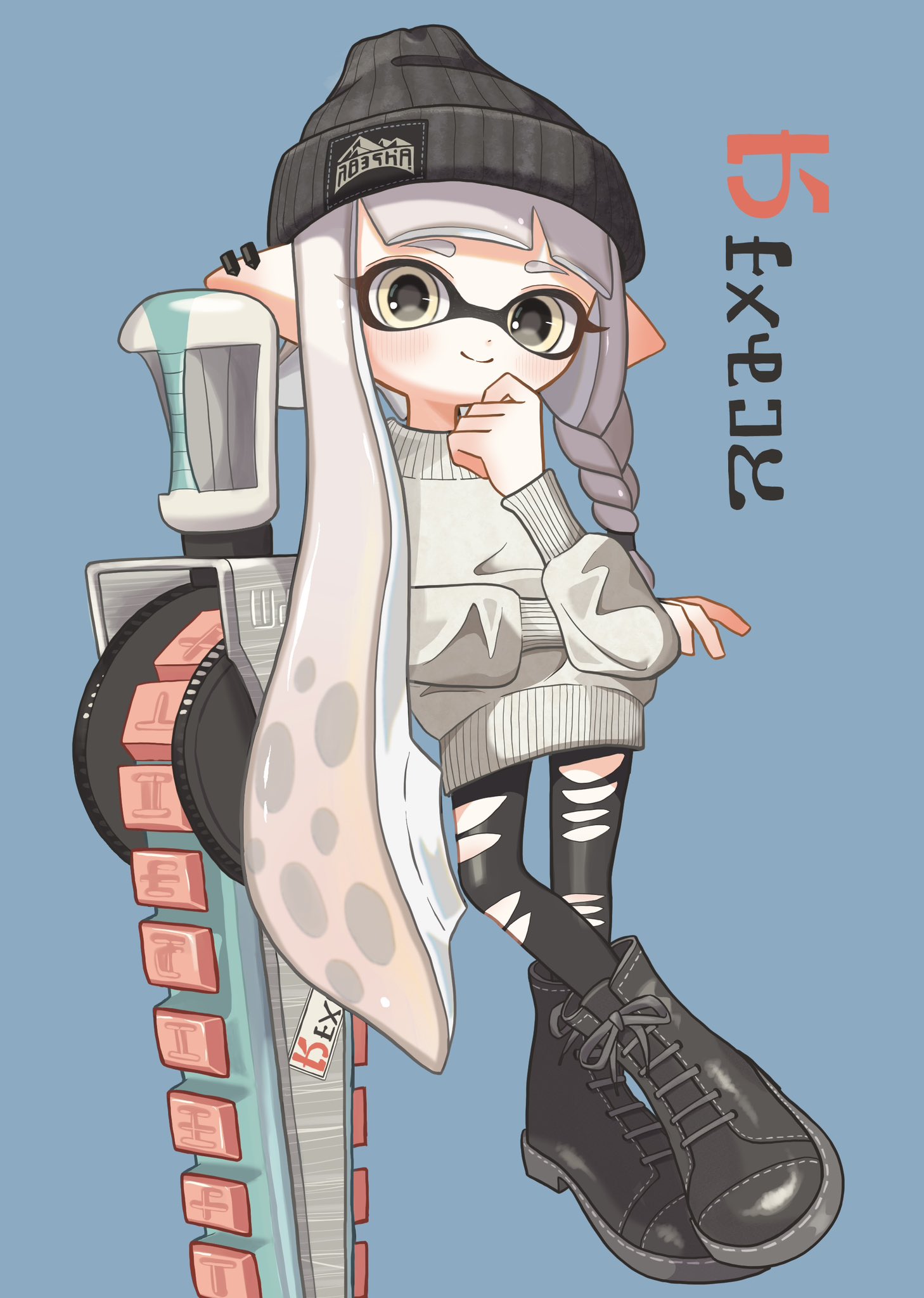 1girl beanie black_boots black_hat black_pants blue_background boots braid closed_mouth commentary full_body grey_hair hat highres inkling inkling_girl inkling_player_character lace-up_boots long_hair looking_at_viewer nintendo osakanagumi11 pants pointy_ears simple_background single_braid smile solo splatana_stamper_(splatoon) splatoon_(series) splatoon_3 standing sticker sweater untranslatable_commentary tentacle_hair torn_clothes torn_pants very_long_hair white_sweater yellow_eyes