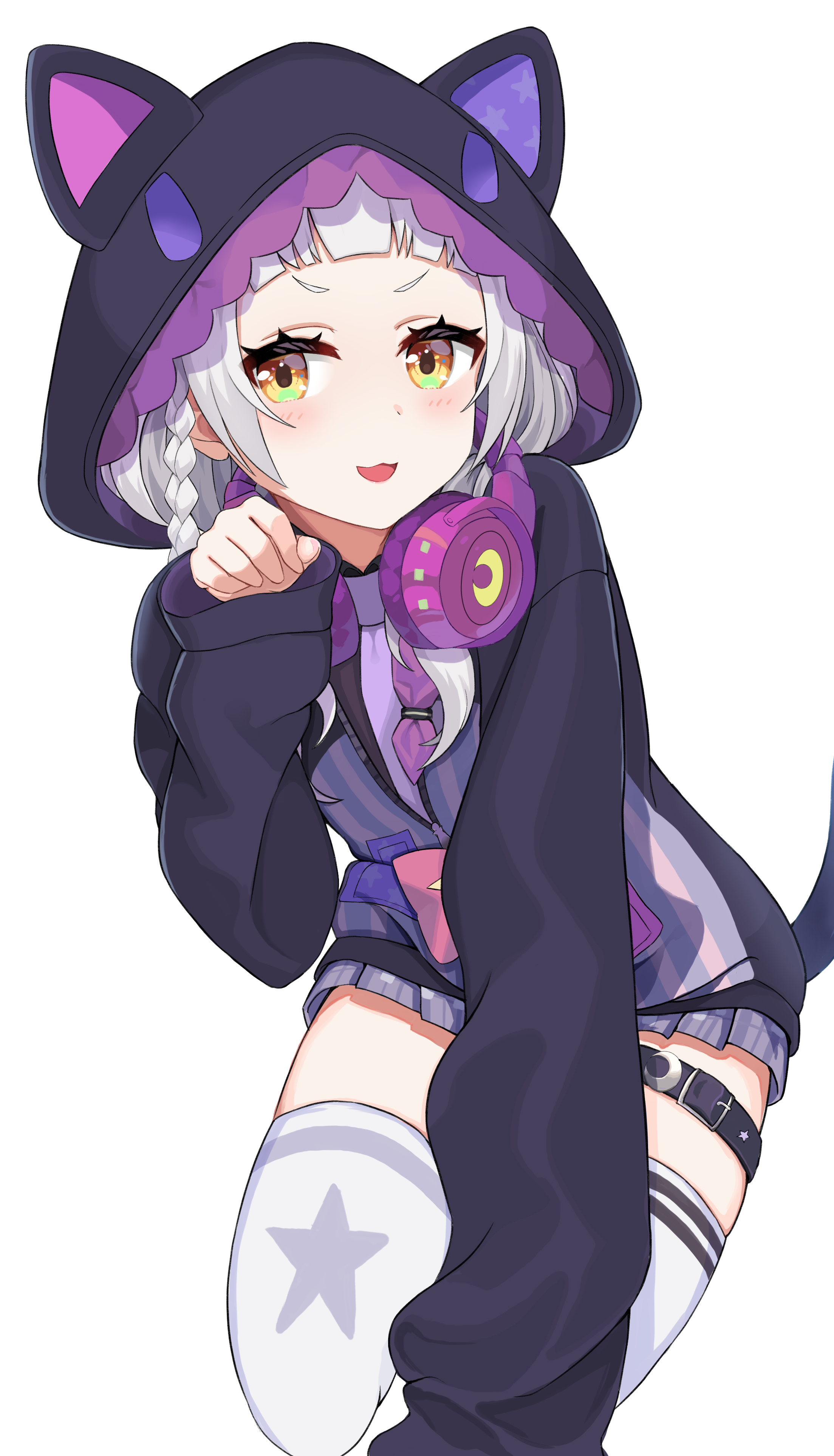 1girl absurdres animal_hood blunt_bangs cat_hood cowboy_shot headphones headphones_around_neck highres hololive hood hoodie jacket looking_at_viewer megurimegu murasaki_shion paw_pose purple_jacket smile solo thighhighs virtual_youtuber white_background white_hair white_thighhighs yellow_eyes zettai_ryouiki
