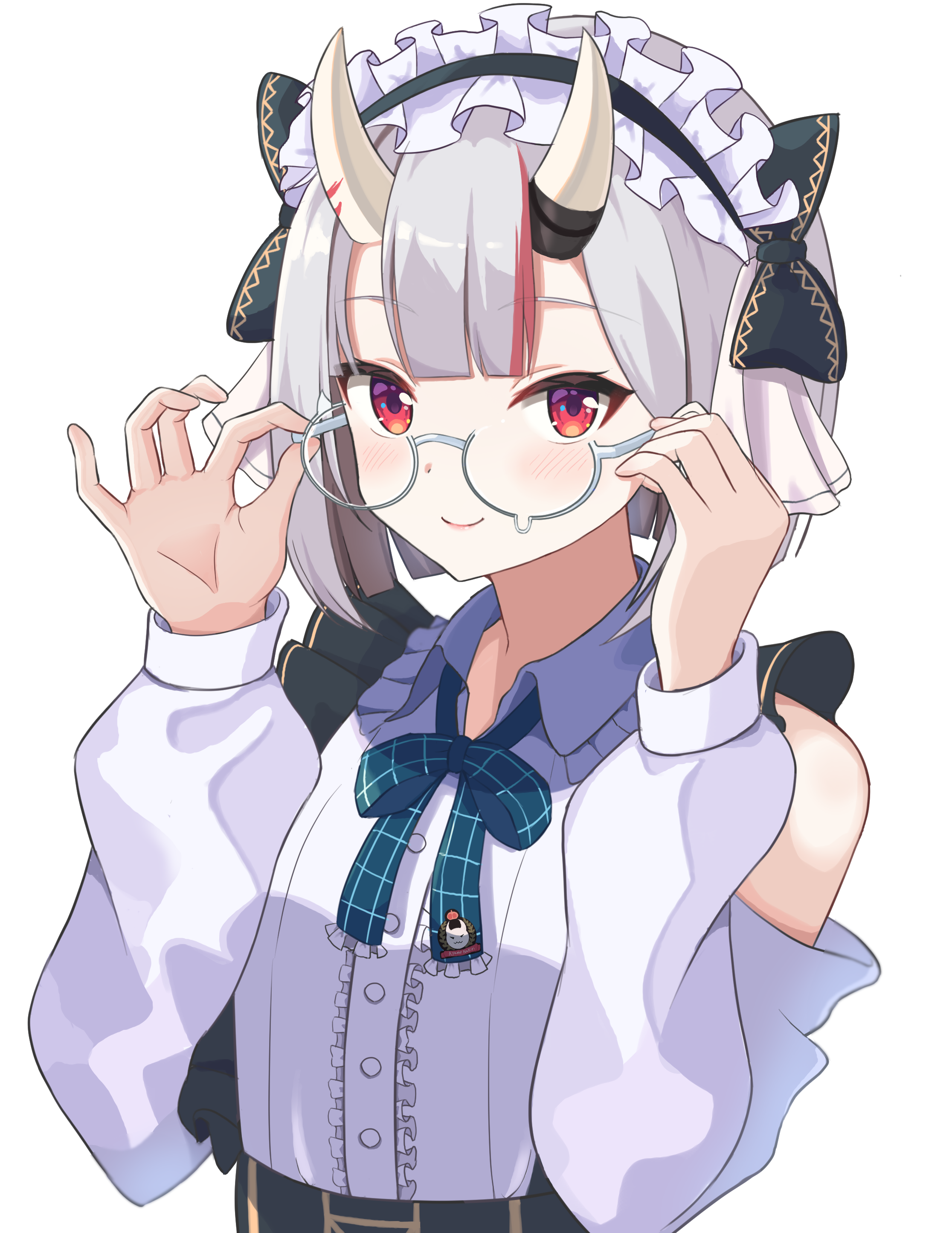 1girl absurdres clothing_cutout glasses headdress highres holding holding_removed_eyewear hololive horns looking_at_viewer medium_hair megurimegu nakiri_ayame oni portrait red_eyes shirt shoulder_cutout smile solo teardrop-framed_glasses unworn_eyewear virtual_youtuber white_background white_hair white_shirt