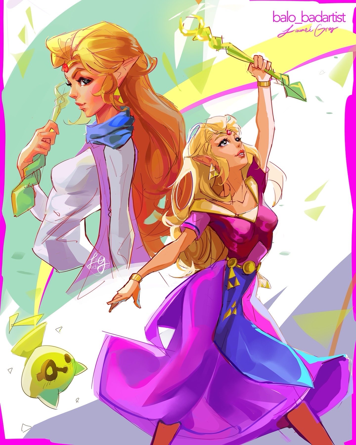 1girl artist_name balo_badartist blonde_hair blue_scarf breasts dress earrings feet_out_of_frame highres holding holding_wand jewelry long_dress long_hair long_sleeves medium_breasts multiple_views nintendo parted_lips pink_dress princess_zelda scarf short_sleeves sidelocks the_legend_of_zelda the_legend_of_zelda:_echoes_of_wisdom tiara triforce upper_body wand