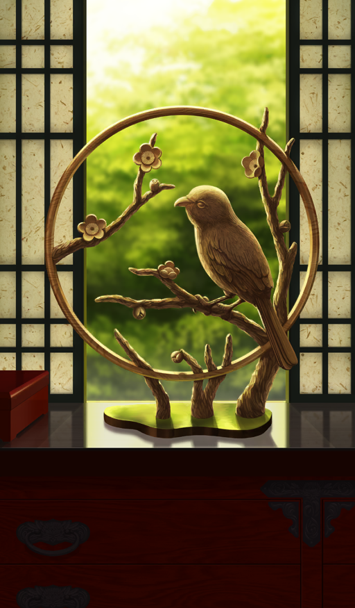 akitaken_(non_faciem) blurry blurry_background branch commentary day fate/grand_order fate_(series) indoors no_humans object_focus official_art sculpture shrike_(animal) still_life sunlight third-party_source tree