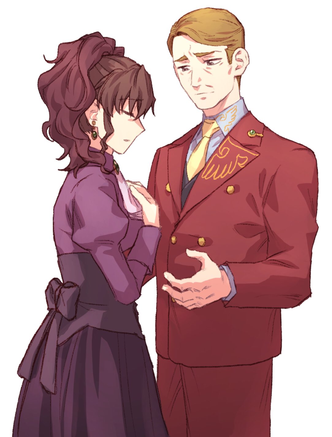 1boy 1girl blonde_hair bow brown_hair closed_eyes closed_mouth dress formal_clothes highres hswoimuxk0pwr0h_(bbdan) husband_and_wife jacket long_hair necktie pants purple_bow purple_dress red_jacket red_pants red_suit short_hair simple_background standing suit umineko_no_naku_koro_ni ushiromiya_krauss ushiromiya_natsuhi white_background yellow_necktie