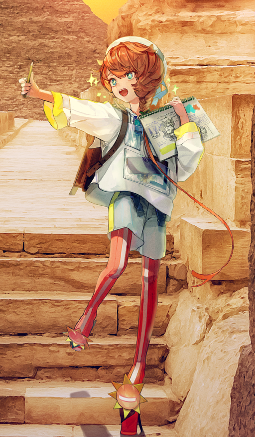 1girl backpack bag beret blue_eyes braid brown_bag commentary drawing_(object) fate/grand_order fate_(series) full_body hat holding holding_pencil holding_sketchbook kibadori_rue leg_up long_hair long_sleeves medjed_(fate) mini_nobu_(fate) oda_nobunaga_(fate) official_art orange_hair outdoors pantyhose pencil photo_background print_shirt red_pantyhose shirt shorts side_braid single_braid sketchbook solo sparkle sparkling_eyes standing standing_on_one_leg third-party_source van_gogh_(fate) van_gogh_(tour_outfit)_(fate) very_long_hair white_hat white_shirt white_shorts