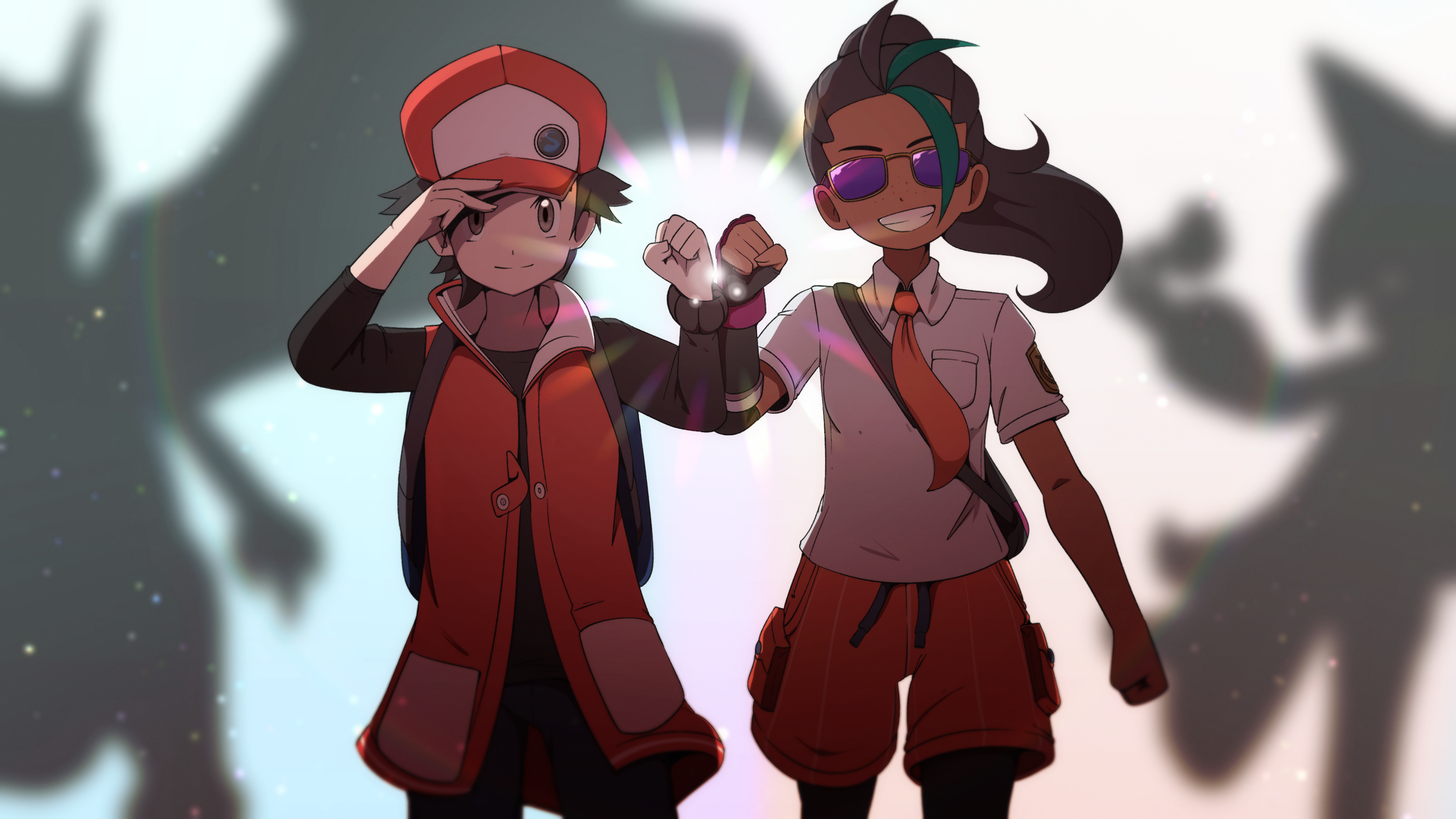1boy 1girl baseball_cap black_hair charizard collared_shirt cowboy_shot fist_bump gen_1_pokemon green_hair hand_on_headwear hat highres itsapmseymour looking_at_viewer meowscarada multicolored_hair naranja_academy_school_uniform necktie nemona_(pokemon) nintendo official_alternate_costume orange_necktie pokemon pokemon_(creature) pokemon_masters_ex pokemon_scarlet_and_violet ponytail purple-tinted_eyewear red_(pokemon) red_(sygna_suit)_(pokemon) school_uniform shirt sunglasses tinted_eyewear two-tone_hair white_shirt