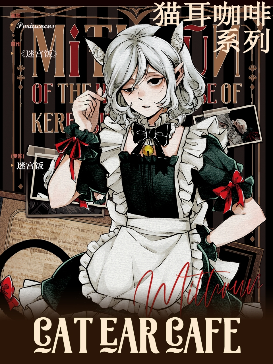 1boy alternate_costume androgynous animal_ears apron bags_under_eyes bell black_dress black_eyes cat_boy cat_ears cat_tail choker crossdressing crossdressing_(mtf) dress dungeon_meshi elf enmaided frilled_apron frilled_choker frills grey_hair hand_on_own_hip highres kemonomimi_mode lazy_eye maid maid_apron male_focus male_maid mithrun neck_bell neck_ribbon notched_ear pointy_ears poriacocos_(lofter) puffy_sleeves ribbon short_hair short_sleeves solo tail trap uneven_eyes upper_body wavy_hair white_apron