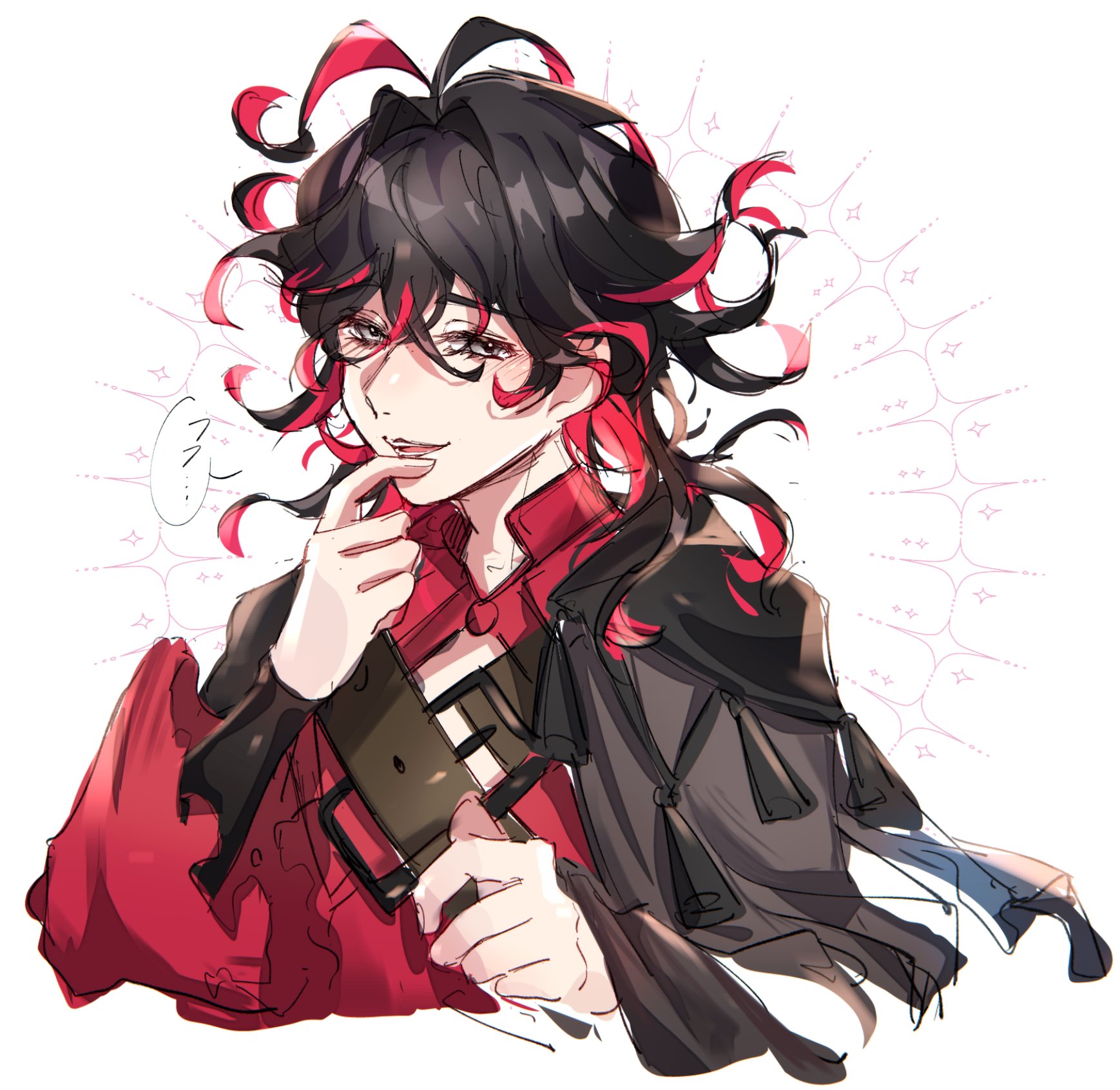 1boy black_hair chest_belt cloak colored_inner_hair curly_hair dante_alighieri_(fate) dante_alighieri_(second_ascension)_(fate) fate/grand_order fate_(series) grey_eyes highres long_sleeves looking_at_viewer male_focus medium_hair multicolored_hair red_hair sarakiel shirt smile solo speech_bubble tassel two-tone_hair upper_body white_background