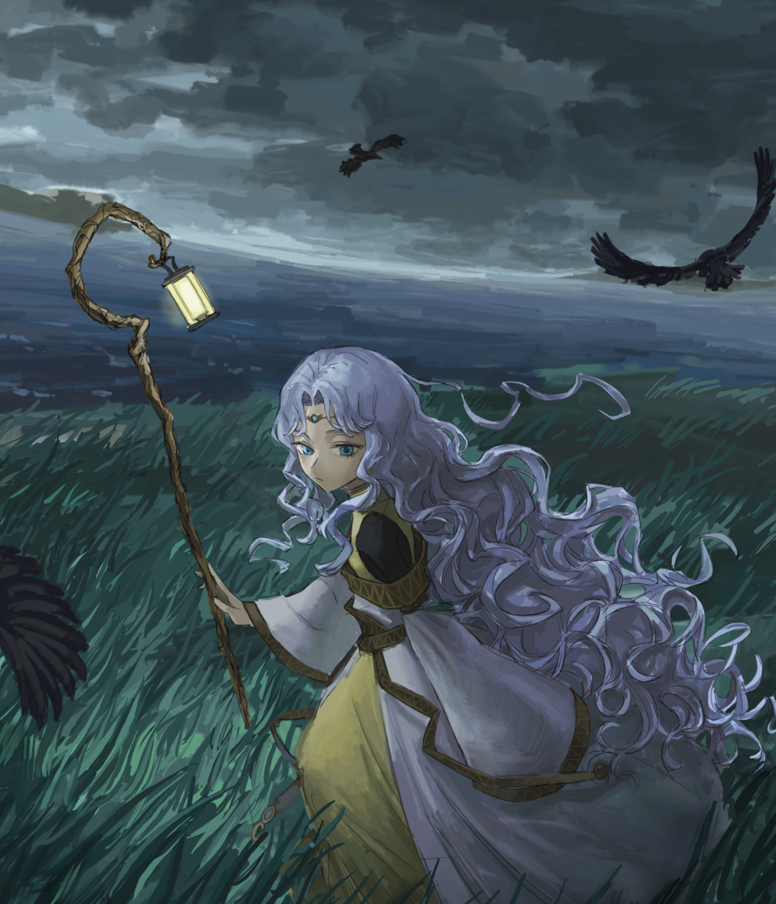 1girl bird blue_eyes circlet closed_mouth cloud commentary_request crow curly_hair dark_cloud fire_emblem fire_emblem:_thracia_776 flying grass highres holding holding_staff horizon long_hair night nintendo ocean on_ground purple_hair sallow_artist sara_(fire_emblem) solo staff standing very_long_hair