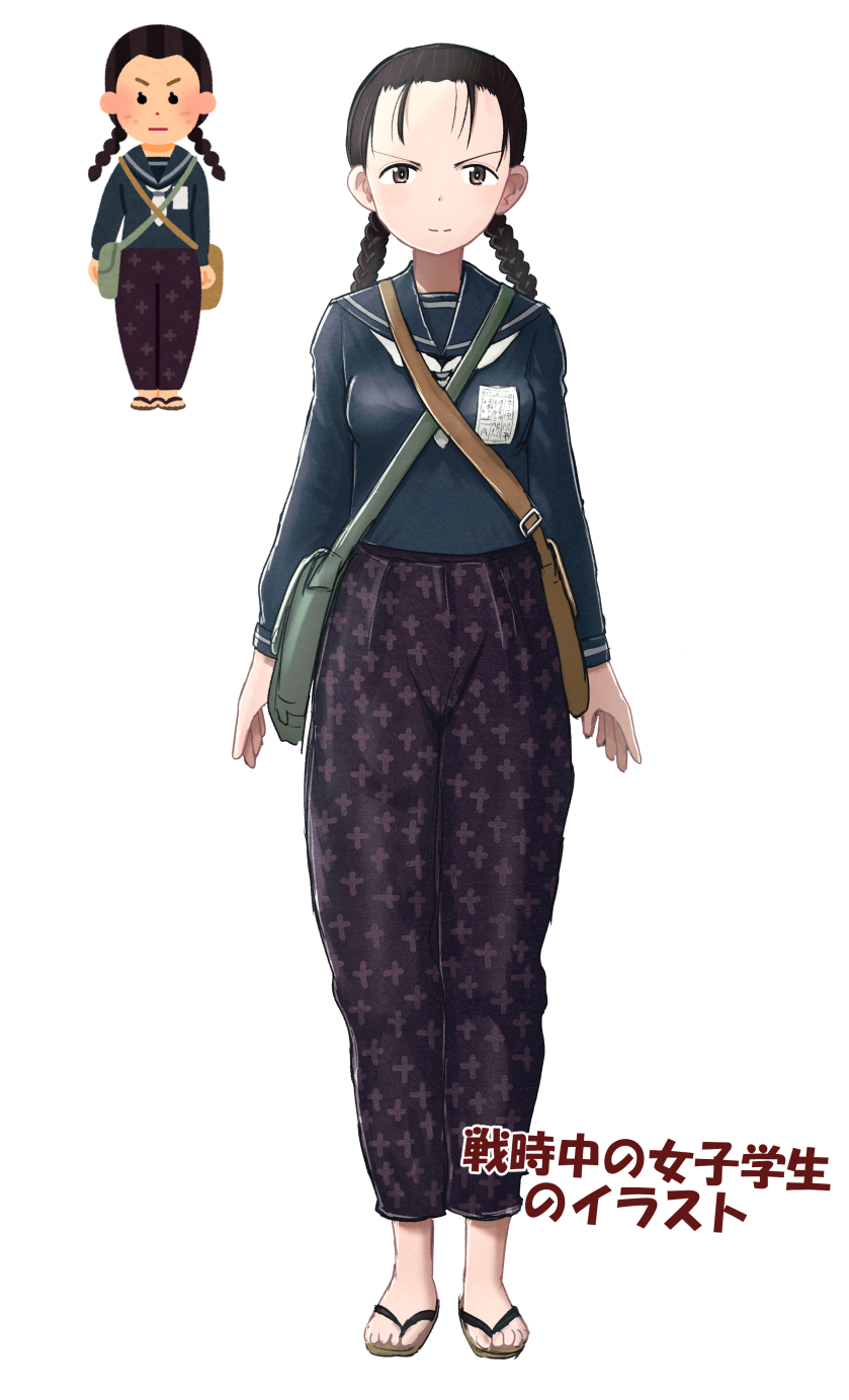1girl arms_at_sides bag black_hair braid breasts dual_wielding full_body handbag highres holding irasutoya irasutoya_challenge low_twin_braids low_twintails medium_breasts neckerchief reference_inset saitou_kaoru_(nashorn) sandals school_uniform serafuku simple_background twin_braids twintails white_background white_neckerchief