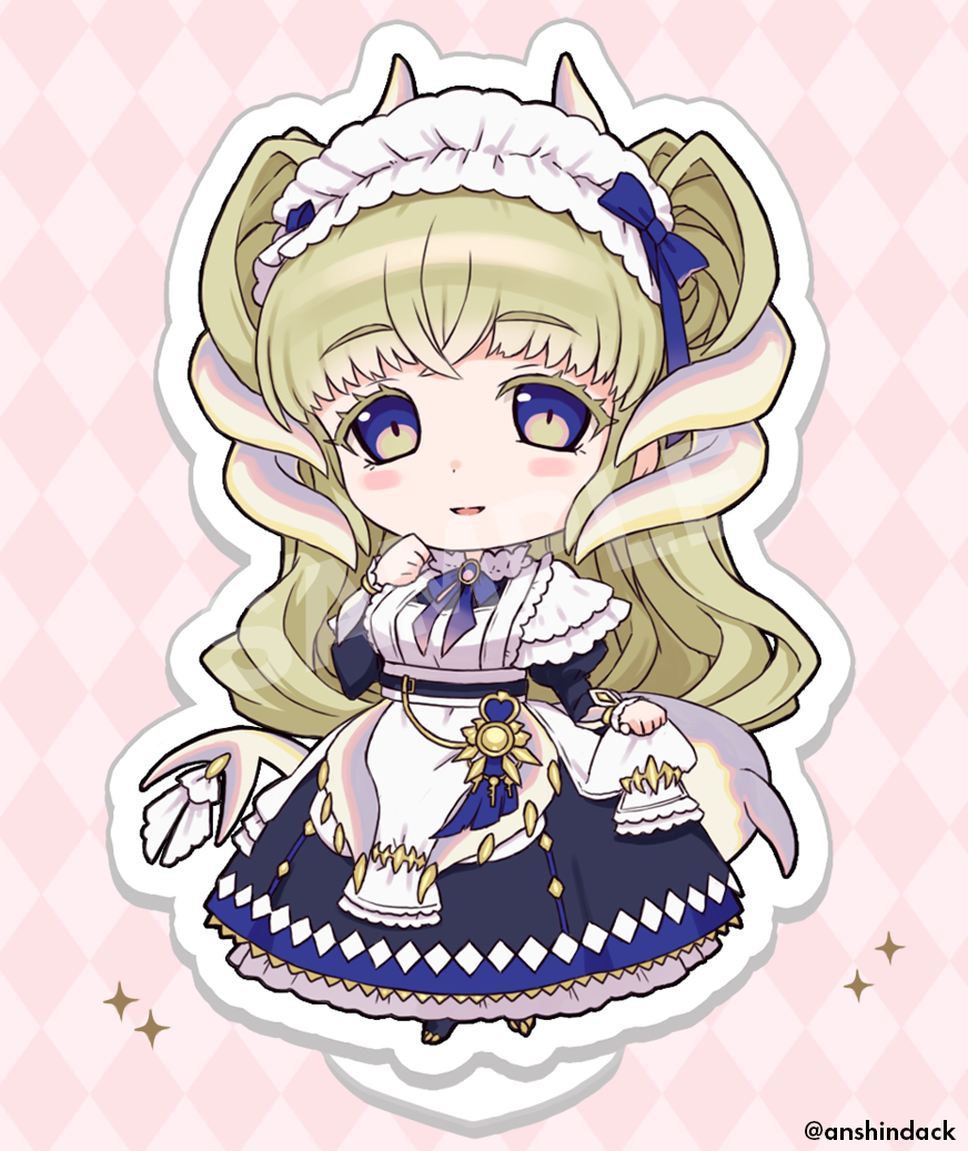 1girl apron blonde_hair blush checkered_background chibi clothes_lift dragon_girl dragon_horns dragon_tail dragon_wings duel_monster frilled_apron frilled_hairband frills hairband horns kaiba_tomoyuki lady's_dragonmaid lifting_own_clothes long_hair long_sleeves looking_at_viewer maid maid_apron maid_headdress open_mouth puffy_long_sleeves puffy_sleeves sample_watermark skirt skirt_lift smile solo tail twitter_username very_long_hair watermark white_apron wings yu-gi-oh!
