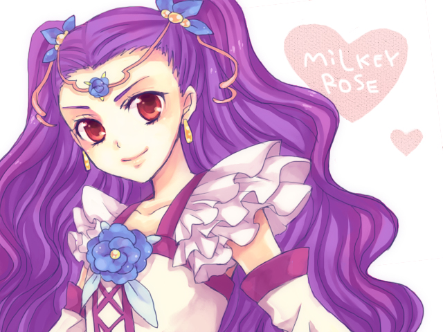 00s 1girl bad_id bad_pixiv_id blue_flower blue_rose character_name earrings female_focus flower frills hair_ornament hair_ribbon hairpin heart jewelry long_hair maco_(munya) magical_girl milk_(precure) milky_rose mimino_kurumi precure purple_hair red_eyes ribbon rose smile solo two_side_up yes!_precure_5 yes!_precure_5_gogo!