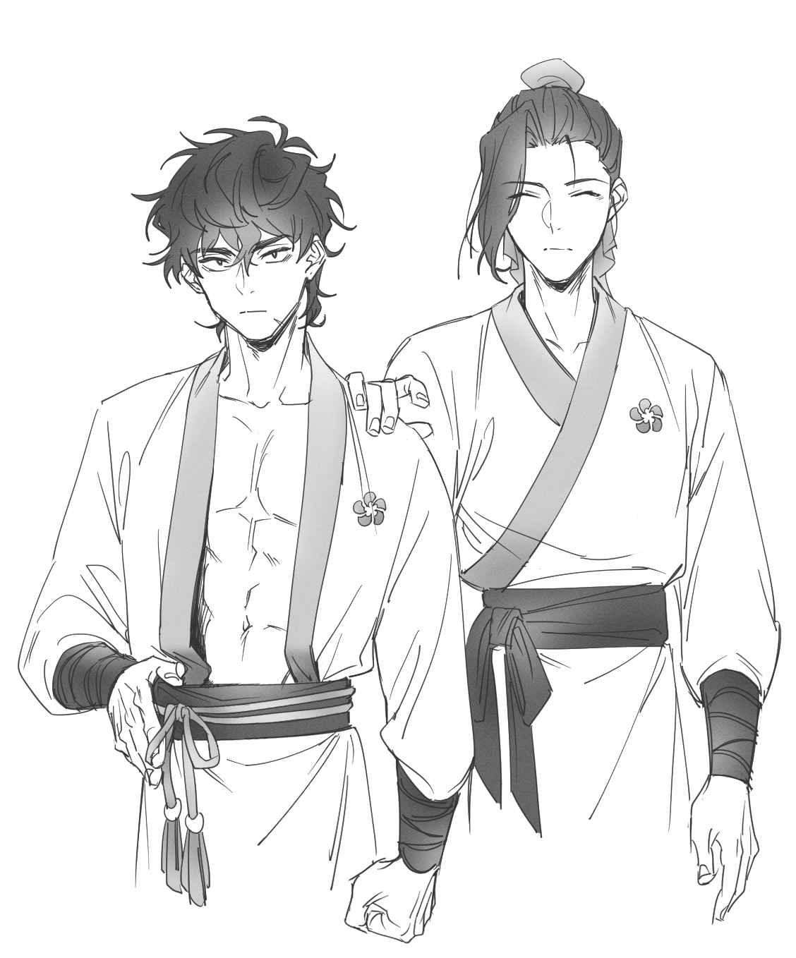 2boys bun_cover chinese_clothes clenched_hand closed_eyes closed_mouth gahya00 greyscale hand_on_another's_shoulder hand_on_own_hip hanfu highres jogeol_(return_of_the_mount_hua_sect) korean_commentary long_sleeves looking_at_viewer male_focus medium_hair monochrome multiple_boys open_clothes return_of_the_mount_hua_sect sash scar scar_on_face simple_background toned toned_male upper_body yunjong_(return_of_the_mount_hua_sect)