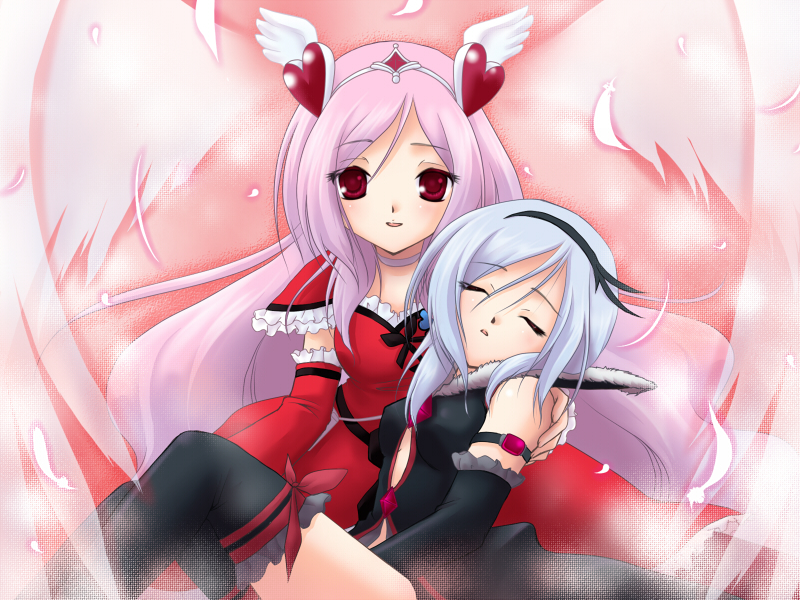 00s 2girls black_legwear choker closed_eyes cure_passion dark_persona dress dual_persona eas_(precure) feathers fresh_precure! frills hair_ornament hairband heart heart_hair_ornament higashi_setsuna long_hair magical_girl multiple_girls narimiya_momone pink_hair precure red_eyes short_hair sleeping smile thighhighs white_choker white_hair wings