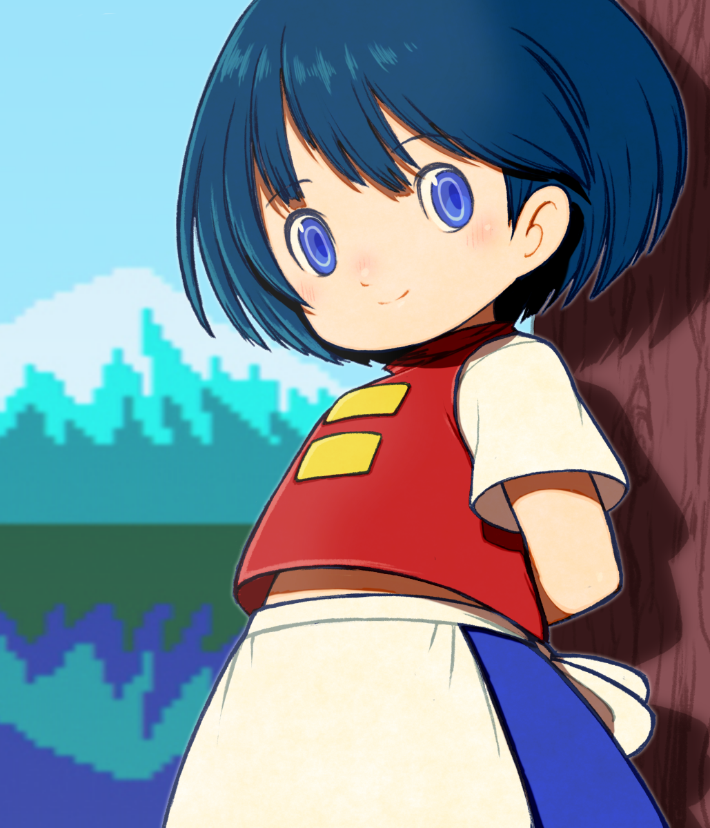 1girl against_tree apron arms_behind_back beeru_(veil8801) blue_eyes blue_hair blue_skirt cal_(ripple_island) closed_mouth highres red_shirt ripple_island shadow shirt short_hair short_sleeves skirt smile solo split_mouth tree waist_apron white_apron