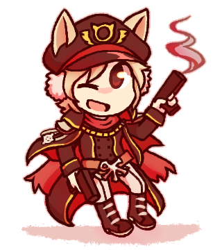 1girl animal_ear_headwear animal_ears bandolier belt black_boots black_coat blckbrd17 blonde_hair boots brown_belt buttons newsboy_cap chibi chibi_only coat commission double-breasted dual_wielding emblem fake_animal_ears full_body gold_trim gun handgun hat holding holding_gun holding_weapon looking_at_viewer lowres military_uniform one_eye_closed open_mouth pants pants_tucked_in ragnarok_online rebellion_(ragnarok_online) short_hair simple_background smile smoke smoking_barrel solo weapon white_background white_pants
