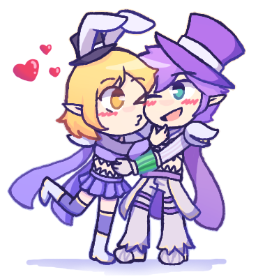 1boy 1girl alternate_color armor blckbrd17 blonde_hair blush boots chibi chibi_only commission full_body genetic_(ragnarok_online) green_eyes grey_pants hat hetero kiss looking_at_another lowres o3o one_eye_closed open_mouth pants pauldrons pleated_skirt pointy_ears purple_hair purple_hat purple_skirt purple_thighhighs ragnarok_online short_hair shoulder_armor simple_background skirt smile standing thighhighs top_hat white_background white_boots yellow_eyes