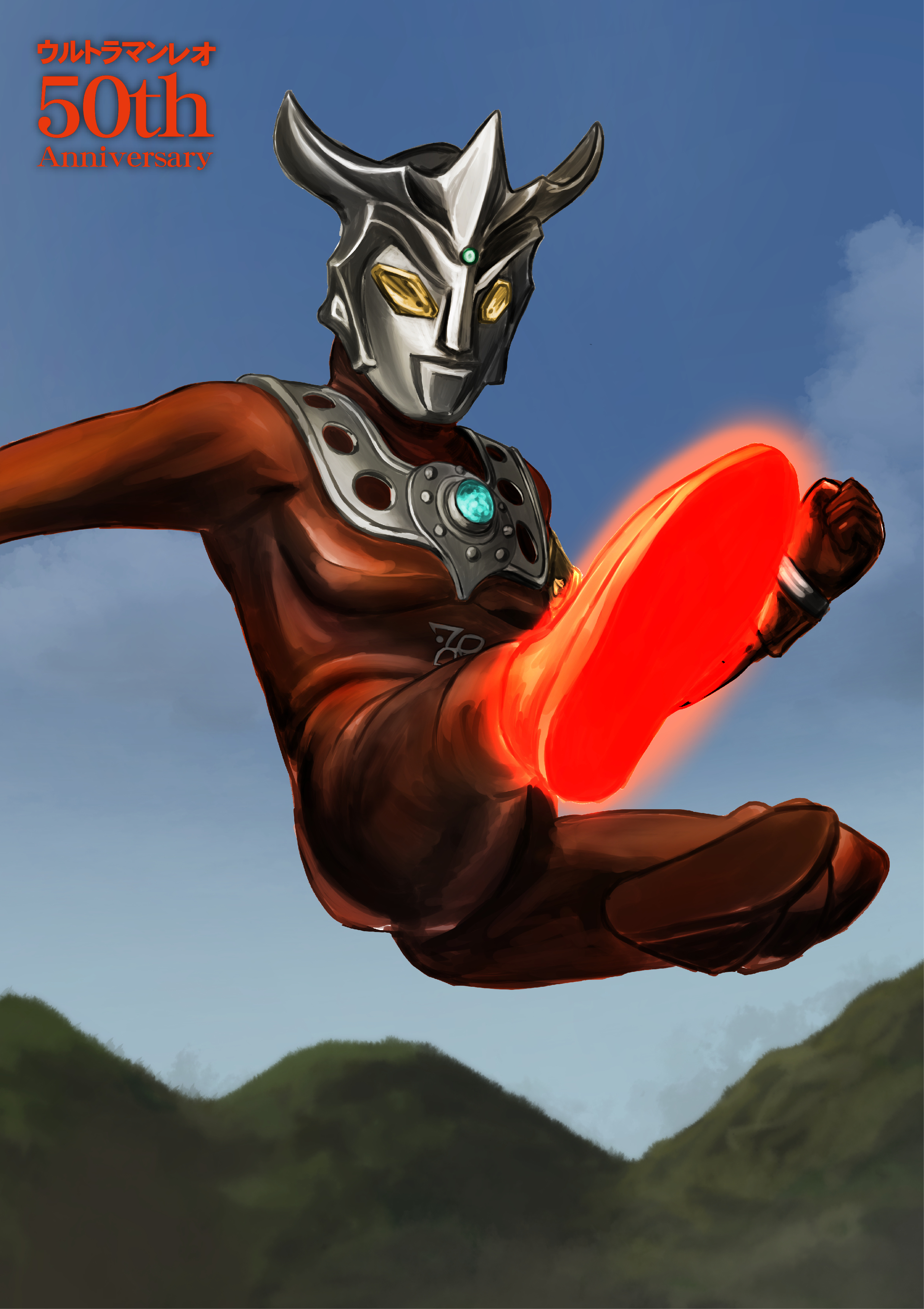 1boy absurdres alien anniversary arm_out_of_frame armlet armor blue_sky bracelet breastplate cloud color_timer colored_skin commentary commission crest day energy english_text finishing_move flying_kick forehead_jewel gattyo gem giant glowing glowing_eyes glowing_feet gold_armlet green_gem highres horns incoming_attack incoming_kick jewelry kicking looking_ahead male_focus midair mixed-language_text mountain outdoors outstretched_arm outstretched_leg pectorals pixiv_commission red_skin silver_bracelet sky solo tokusatsu ultra_series ultraman_leo ultraman_leo_(series) wrinkled_skin yellow_eyes