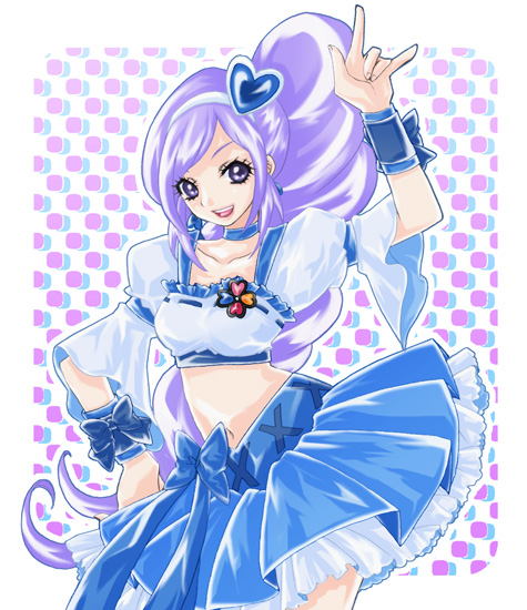 00s 1girl aono_miki arm_up blue_skirt bow choker crop_top cure_berry curly_hair dress earrings eyelashes female_focus fresh_precure! frills hair_ornament hairband hand_on_own_hip happy heart heart_hair_ornament high_ponytail hip_focus jewelry long_hair m/ magical_girl maya+ midriff navel ponytail precure purple_eyes purple_hair ribbon skirt solo