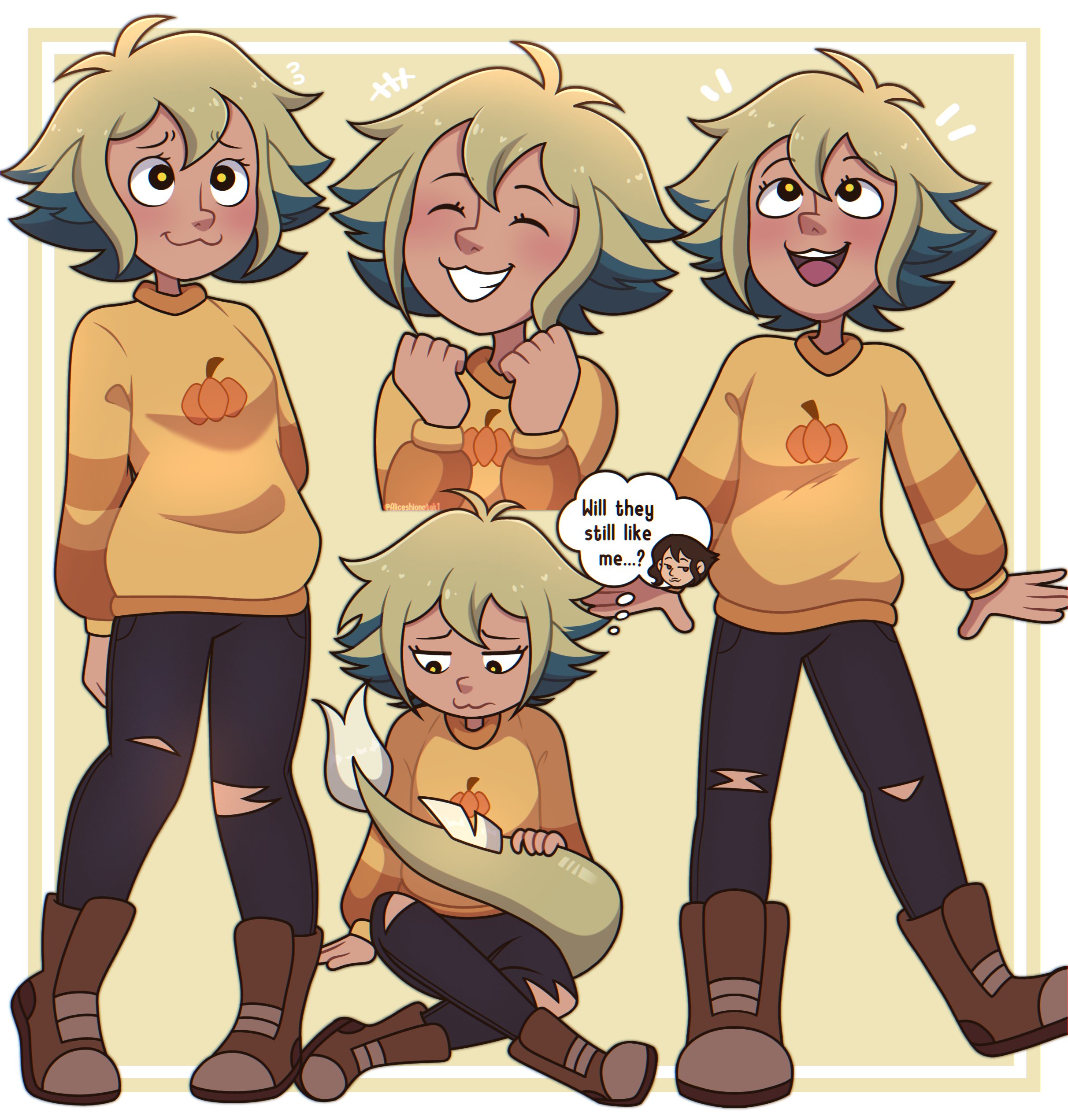 1girl :3 absurdres aliceshionotak1 black_eyes blonde_hair blue_hair boots closed_eyes english_text full_body highres long_sleeves looking_afar looking_up multiple_views pants short_hair sitting smile speech_bubble standing sweater tail teeth the_owl_house thought_bubble vee_(the_owl_house) yellow_pupils yellow_sweater