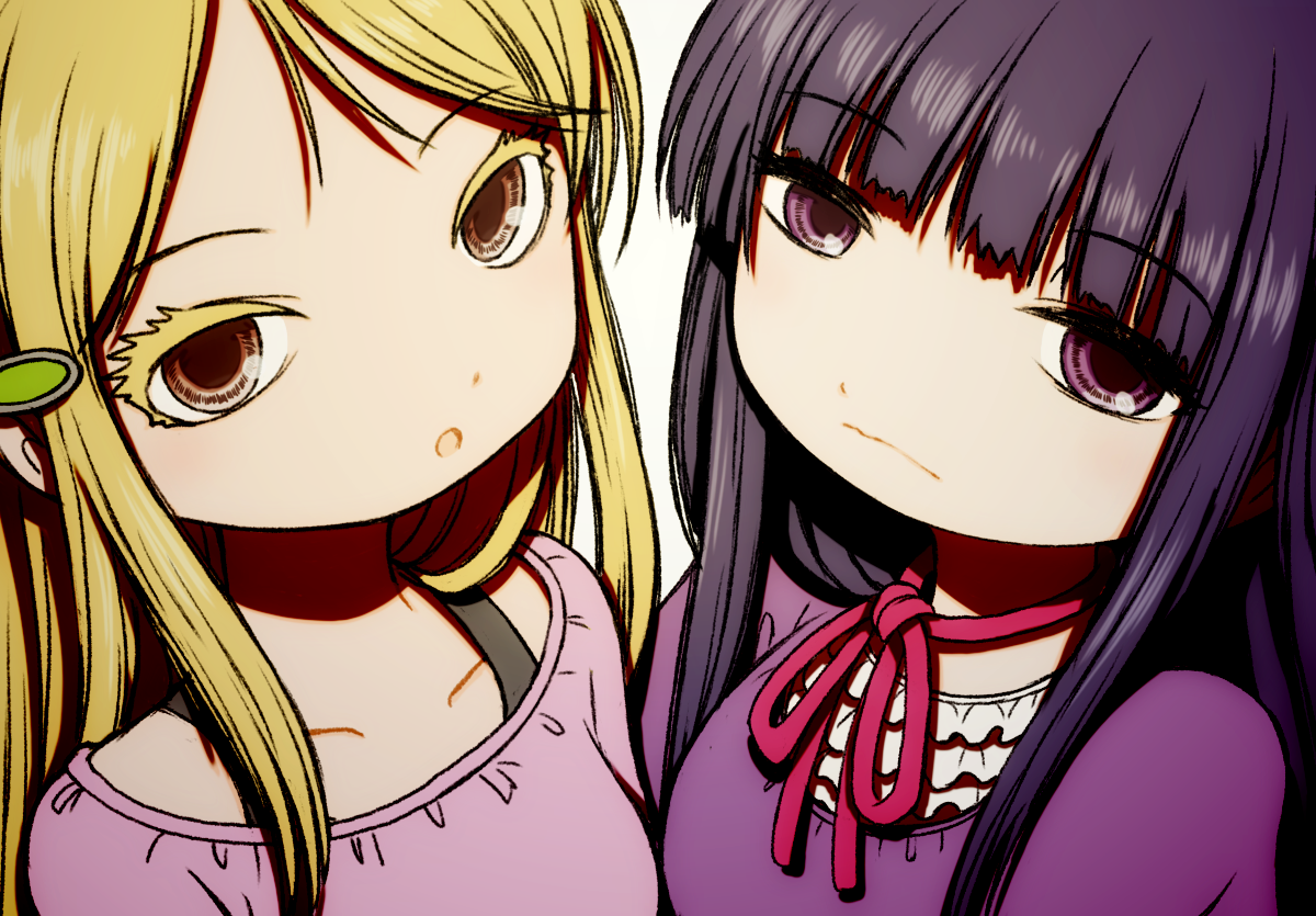 2girls :o beeru_(veil8801) blonde_hair bra_strap brown_eyes closed_mouth collarbone colored_eyelashes hidaka_koharu high_score_girl long_hair multiple_girls neck_ribbon oono_akira open_mouth purple_eyes purple_hair red_ribbon ribbon simple_background white_background