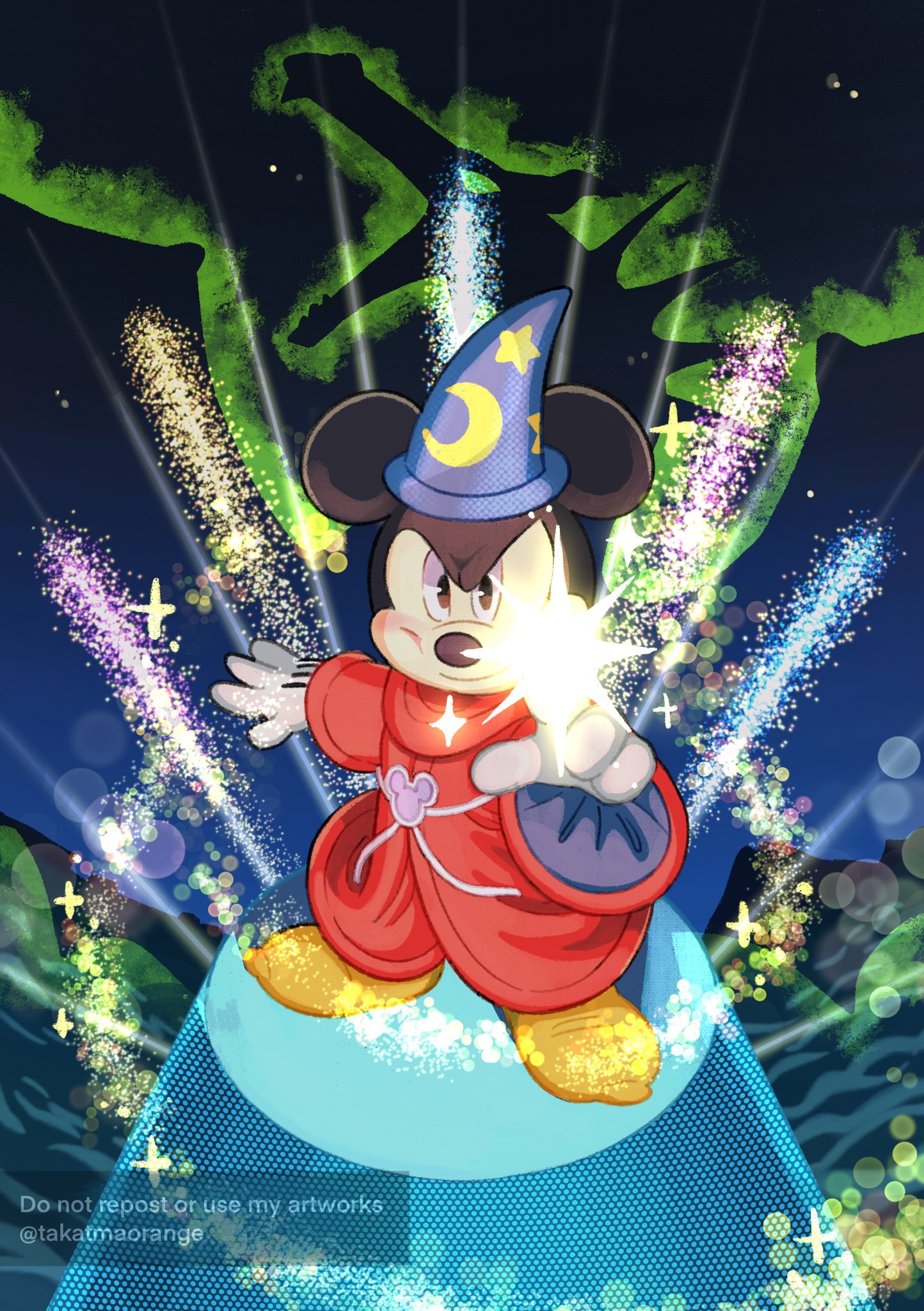 1boy animal_ears disney fantasia_(disney) gloves hat highres looking_at_viewer magic male_focus mickey_mouse mickey_mouse_&_friends mouse_boy mouse_ears solo tagme takatmaorange the_sorcerer's_apprentice wizard wizard_hat