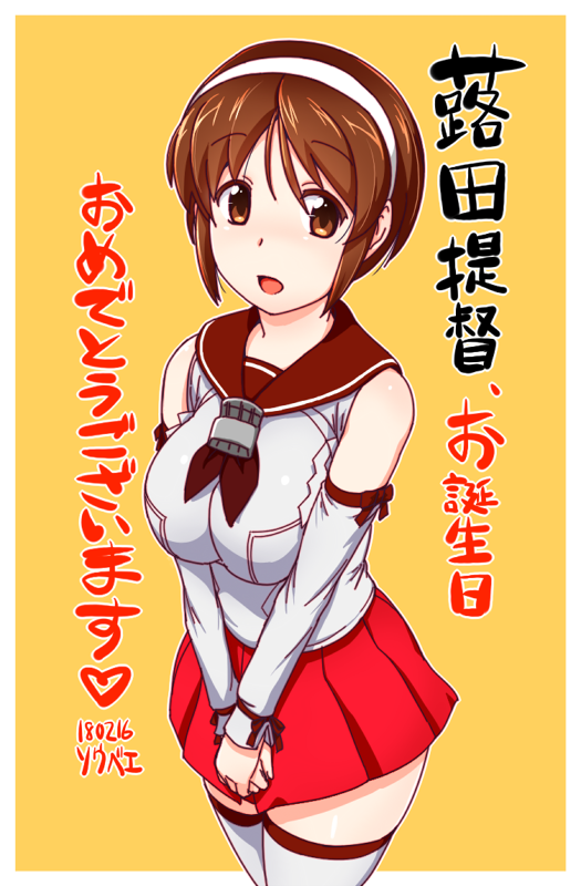 1girl breasts brown_eyes brown_hair detached_sleeves gift_art hairband kantai_collection large_breasts looking_at_viewer natori_(kancolle) neckerchief open_mouth pleated_skirt red_skirt sailor_collar school_uniform serafuku shirt short_hair simple_background skirt sleeveless sleeveless_shirt solo soubee1 thighhighs white_hairband white_thighhighs