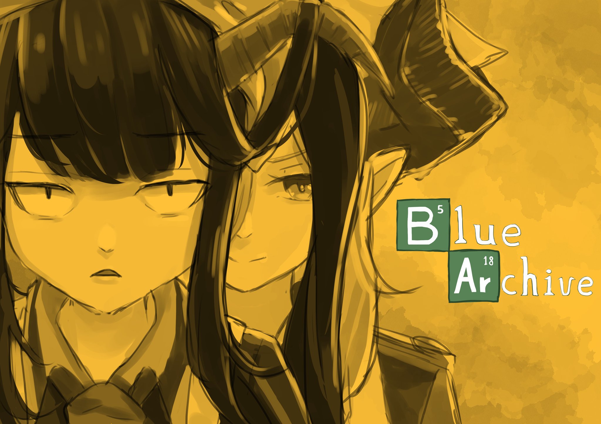 2girls blue_archive breaking_bad demon_horns fuuka_(blue_archive) gourmet_research_society_(blue_archive) highres horns id_han juri_(blue_archive) logo looking_at_viewer multiple_girls necktie parody partially_colored yellow_background