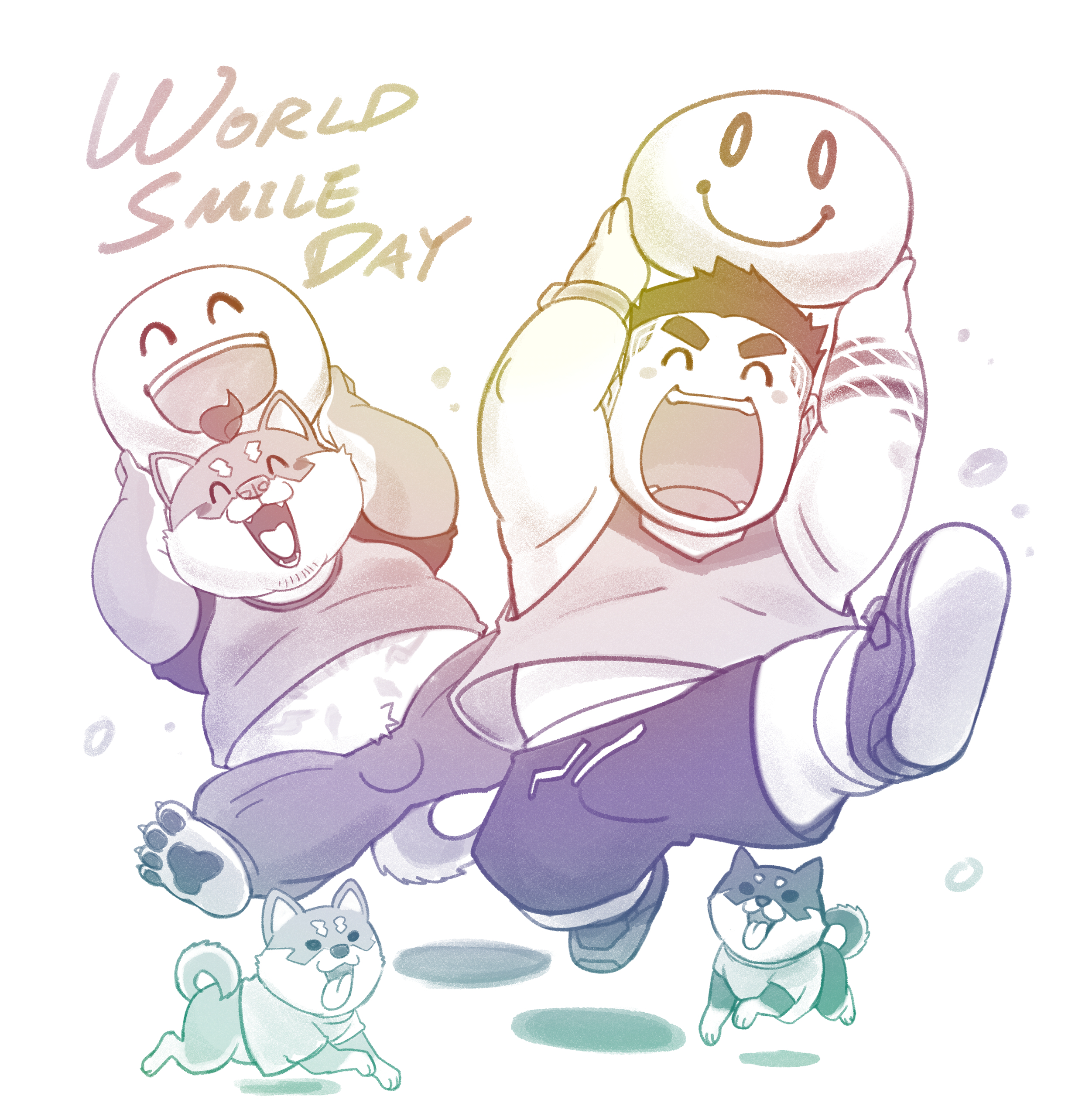 2boys absurdres animal_ears bulge chibi commentary dog_boy dog_ears dog_tail english_commentary english_text facing_viewer furry furry_male heart highres hikoero777 holding male_focus midriff_peek multiple_boys official_art open_mouth shiba_inu shibahiko_(xxl) smile tail xxl_woofia ying_hugeeu_(xxl)