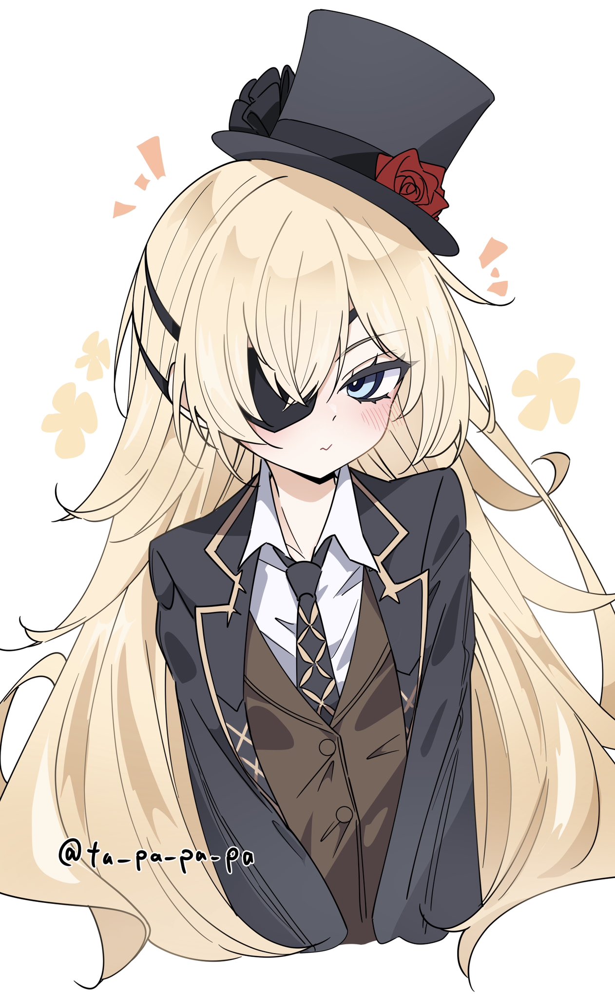 1girl artist_name black_hat blonde_hair blue_eyes brown_vest eyepatch goddess_of_victory:_nikke grey_jacket grey_necktie guillotine_(dark_tracer)_(nikke) guillotine_(nikke) hair_between_eyes hat highres jacket long_hair necktie shirt simple_background solo tu_pa_pa_pa vest white_background white_shirt