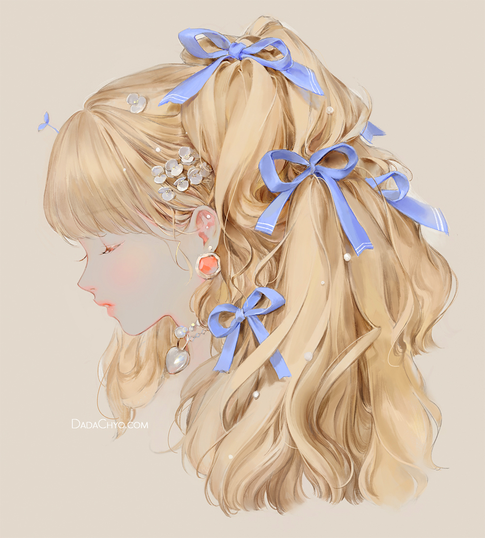 1girl artist_name blonde_hair blue_ribbon brown_background chain chain_necklace closed_eyes closed_mouth commentary cropped_head dadachyo earrings english_commentary eyelashes flower from_side hair_flower hair_ornament hair_ribbon heart heart_necklace jewelry lips long_hair necklace nose original profile ribbon solo two_side_up