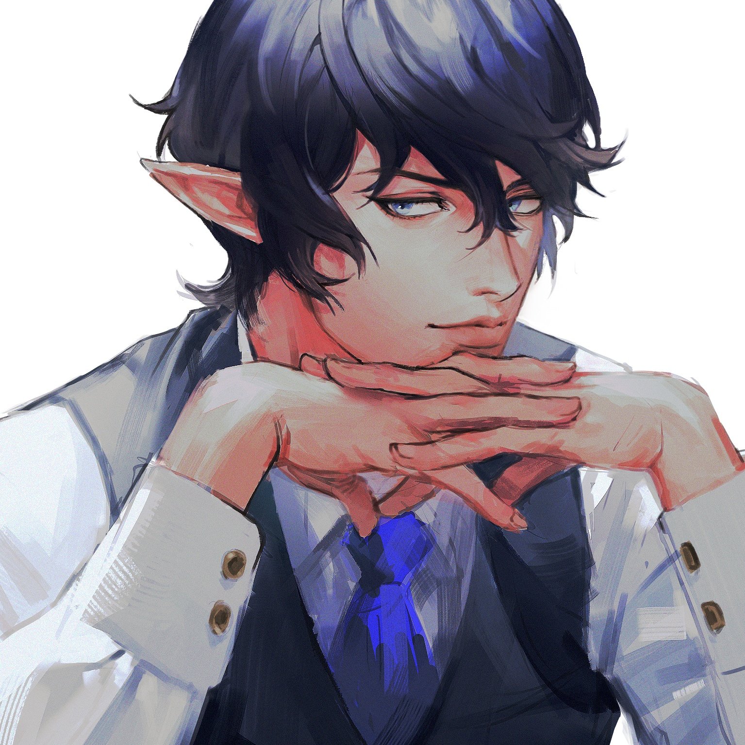 1boy arms_up aymeric_de_borel black_hair black_vest blue_eyes blue_necktie buttoned_cuffs buttons closed_mouth collared_shirt elezen elf final_fantasy final_fantasy_xiv hair_between_eyes highres interlocked_fingers light_smile long_pointy_ears looking_to_the_side male_focus melvinfeat necktie pointy_ears shirt short_hair sideways_glance simple_background sleeve_cuffs solo upper_body vest white_background white_shirt wing_collar