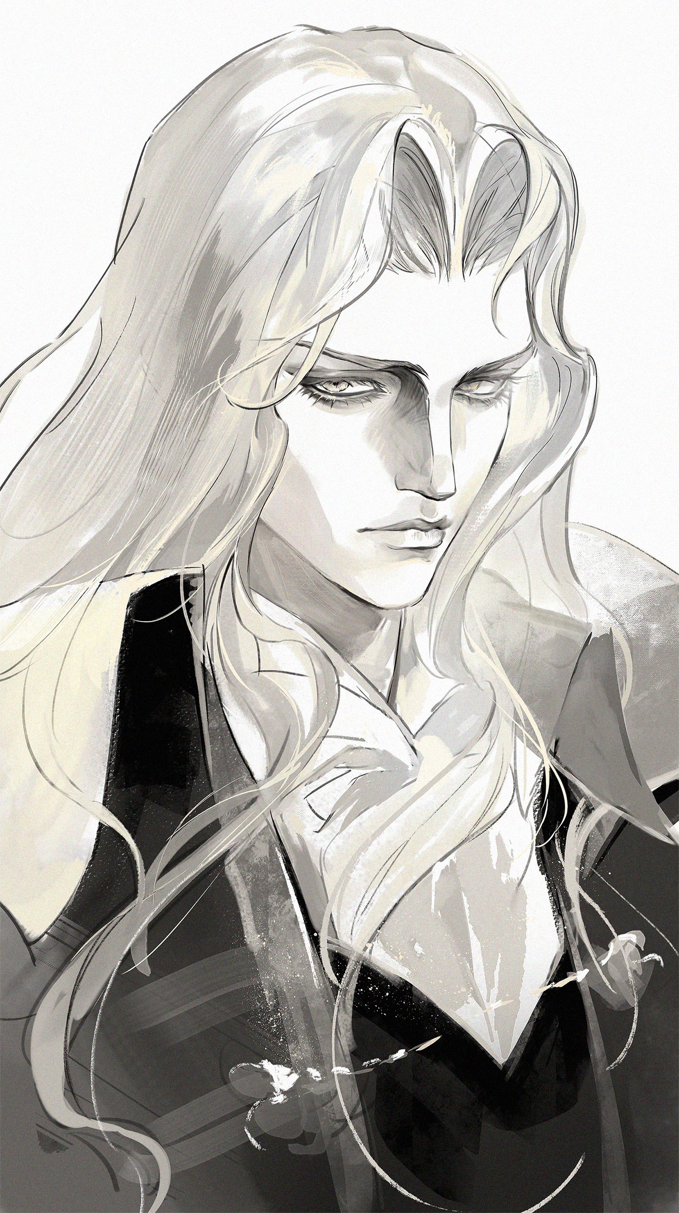1boy absurdres alucard_(castlevania) bishounen black_coat castlevania:_symphony_of_the_night castlevania_(series) chinese_commentary closed_mouth coat collared_shirt commentary_request curtained_hair eyelashes grey_eyes highres long_hair male_focus melvinfeat shirt simple_background solo upper_body very_long_hair wavy_hair white_background white_shirt wing_collar
