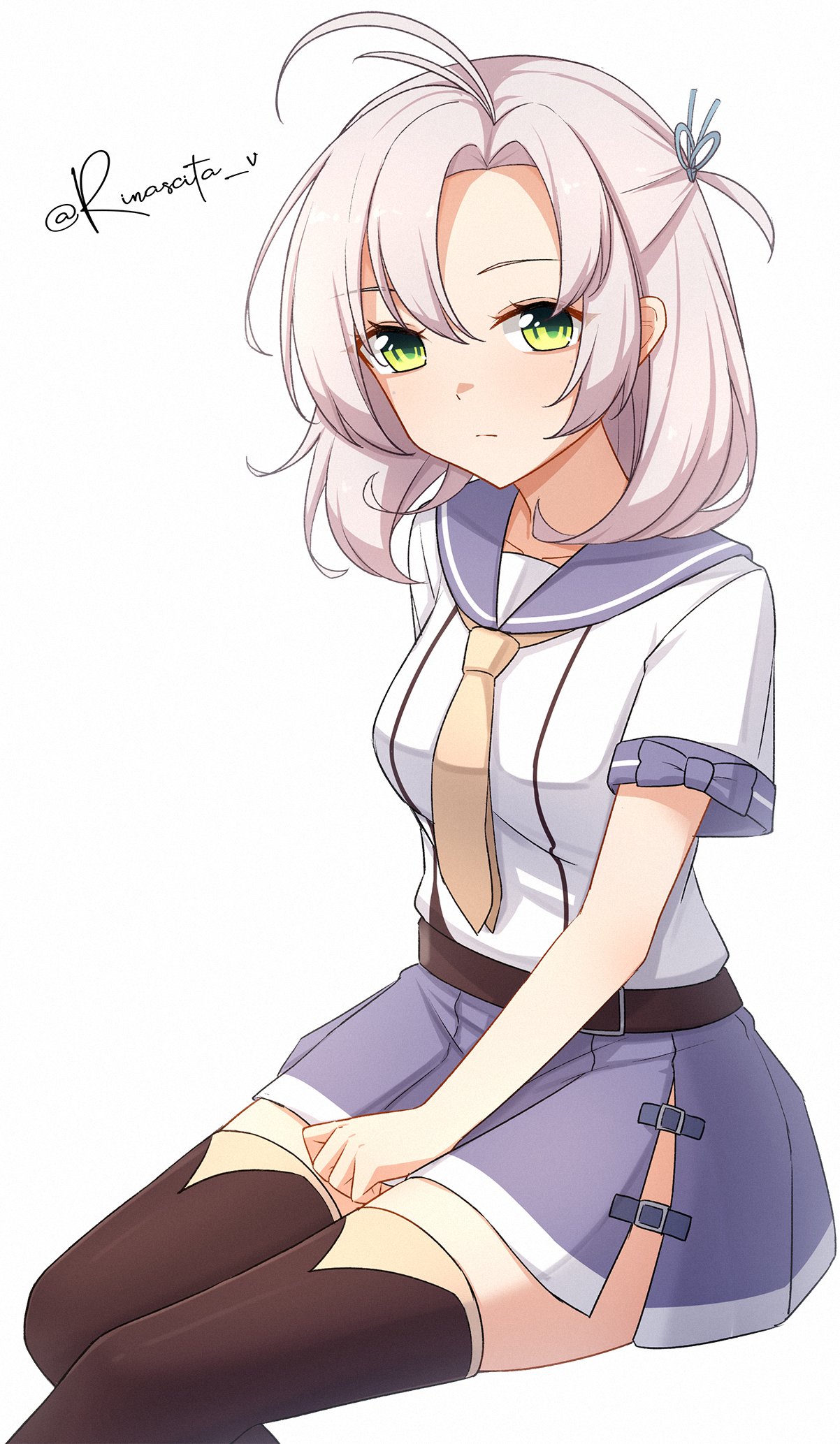 1girl antenna_hair aticsanir breasts green_eyes grey_hair highres kantai_collection kinugasa_(kancolle) kinugasa_kai_ni_(kancolle) looking_at_viewer medium_breasts necktie one-hour_drawing_challenge one_side_up school_uniform serafuku simple_background solo twitter_username white_background yellow_necktie