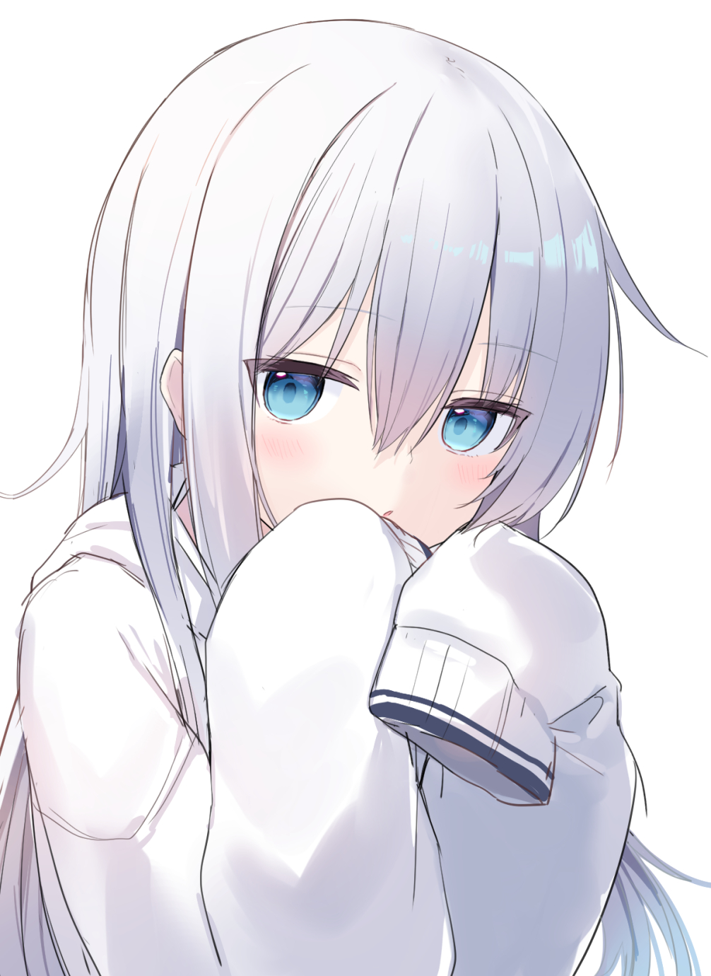 1girl alternate_costume blue_eyes blush commentary double-parted_bangs hair_between_eyes hands_up hibiki_(kancolle) highres hood hood_down hoodie kantai_collection long_hair looking_at_viewer parted_lips shikuro_(iorimiyakiyo) sidelocks simple_background sleeves_past_fingers sleeves_past_wrists solo upper_body white_background white_hair white_hoodie