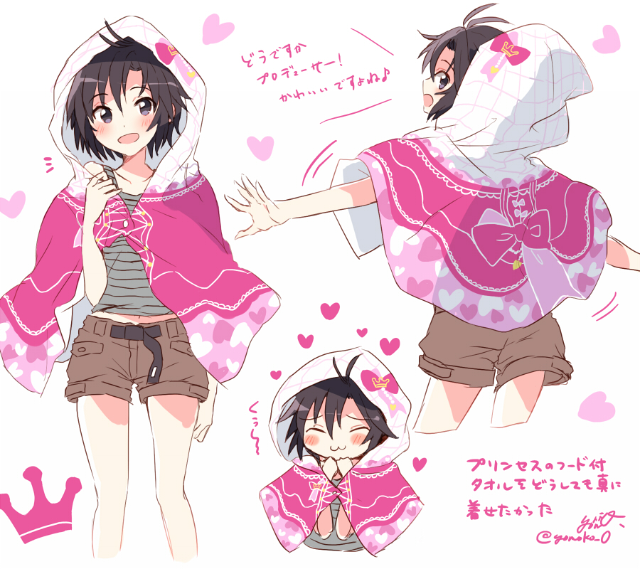 1girl :3 belt black_eyes black_hair blush brown_shorts capelet closed_eyes closed_mouth commentary_request cropped_legs crown_(symbol) from_side green_tank_top heart heart_print hood hood_up hooded_capelet idolmaster idolmaster_(classic) kikuchi_makoto looking_at_viewer looking_back open_mouth short_hair short_shorts shorts simple_background smile tank_top translation_request twitter_username white_background yoriyomo