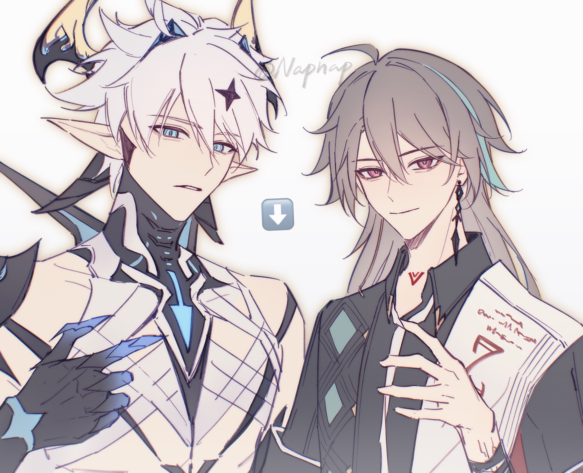 &{ID:11674225 CreatedAt:Thu Mar 27 18:15:15 -0500 2025 Score:0 Width:2456 Height:1993 MD5:6e5674f8cc93e0f275e6d38d0617c583 Directory:6e/56 Image:6e5674f8cc93e0f275e6d38d0617c583.jpg Rating:general Source:https://ababababaaa.lofter.com/post/4b6bbf64_2be13e5b4 Change:1743117316 Owner:danbooru CreatorID:6498 ParentID:0 Sample:1 PreviewHeight:284 PreviewWidth:350 Tags:2boys alternate_form black_shirt blue_eyes chinese_commentary commentary_request demon_horns kevin_kaslana_(diabolic) earrings grey_background grey_hair highres honkai_(series) honkai_impact_3rd horns jewelry kevin_kaslana long_hair male_focus multiple_boys napppptt pointy_ears purple_eyes shirt short_hair su_(honkai_impact) twitter_username two-tone_shirt white_shirt Title: HasNotes:false HasComments:false FileURL:https://img2.gelbooru.com/images/6e/56/6e5674f8cc93e0f275e6d38d0617c583.jpg PreviewURL:https://gelbooru.com/thumbnails/6e/56/thumbnail_6e5674f8cc93e0f275e6d38d0617c583.jpg SampleURL:https://img2.gelbooru.com/samples/6e/56/sample_6e5674f8cc93e0f275e6d38d0617c583.jpg SampleHeight:690 SampleWidth:850 Status:active PostLocked:0 HasChildren:false IsVideo:false DisplayDate:27.03.2025 18:15}