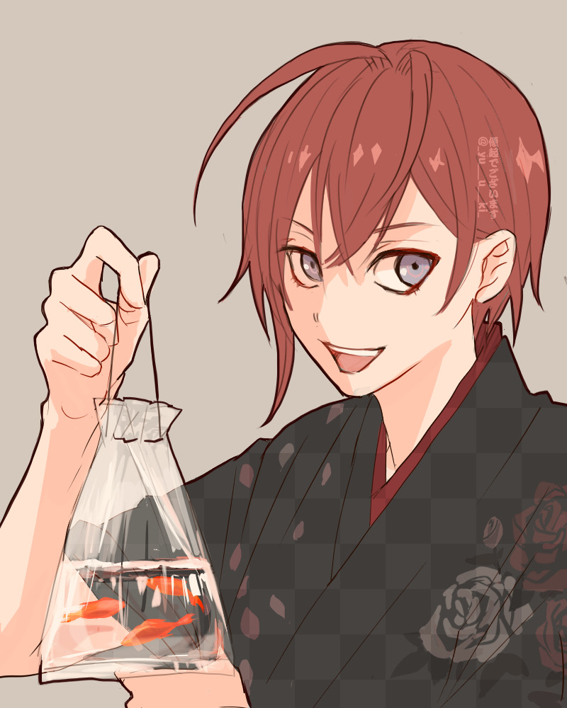 1boy bag bagged_fish black_kimono brown_background checkered_clothes checkered_kimono commentary_request fish goldfish grey_eyes holding japanese_clothes kimono looking_at_viewer male_focus red_hair riddle_rosehearts short_hair simple_background solo twisted_wonderland upper_body yuuki_(yukko7474)